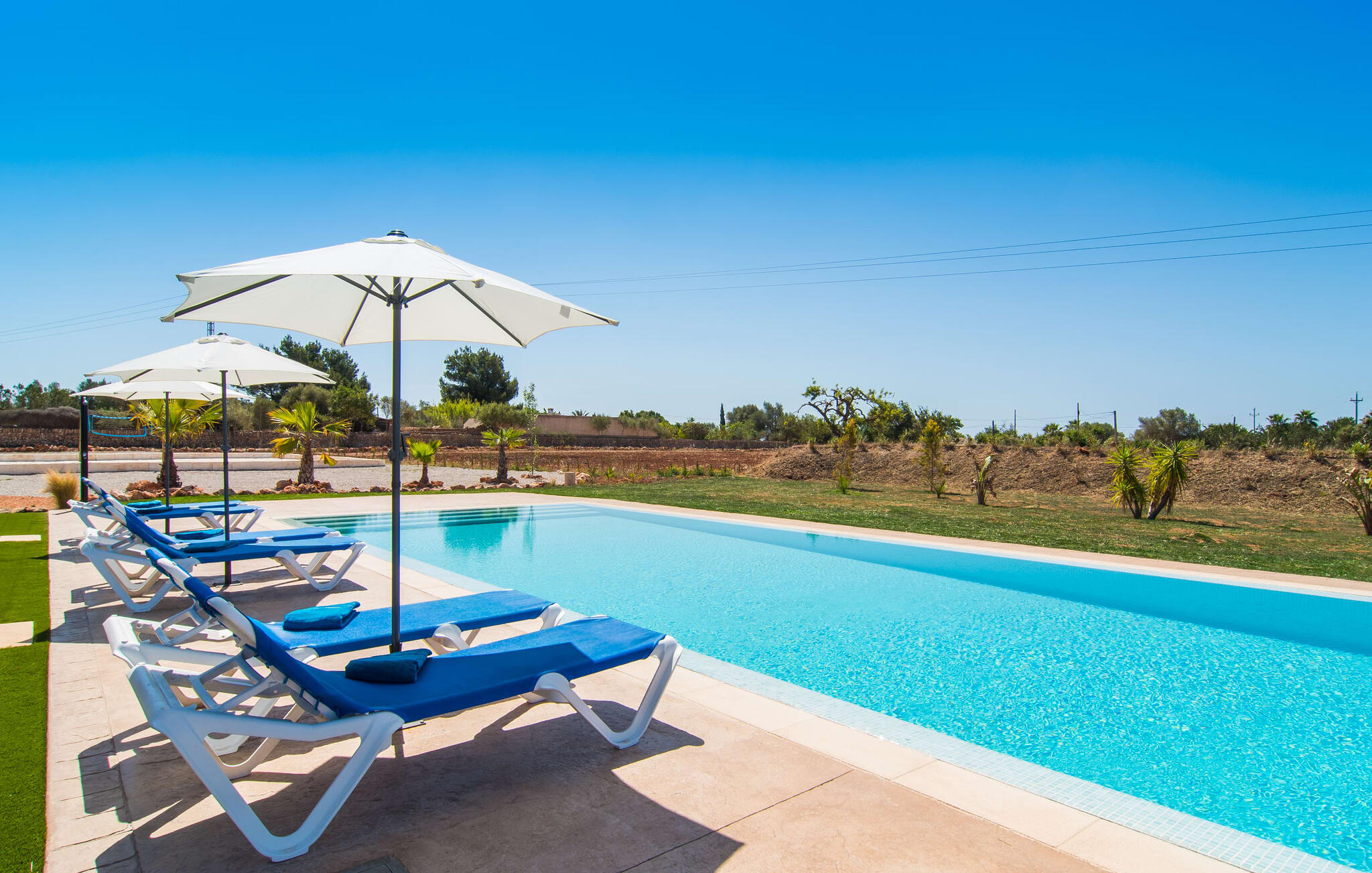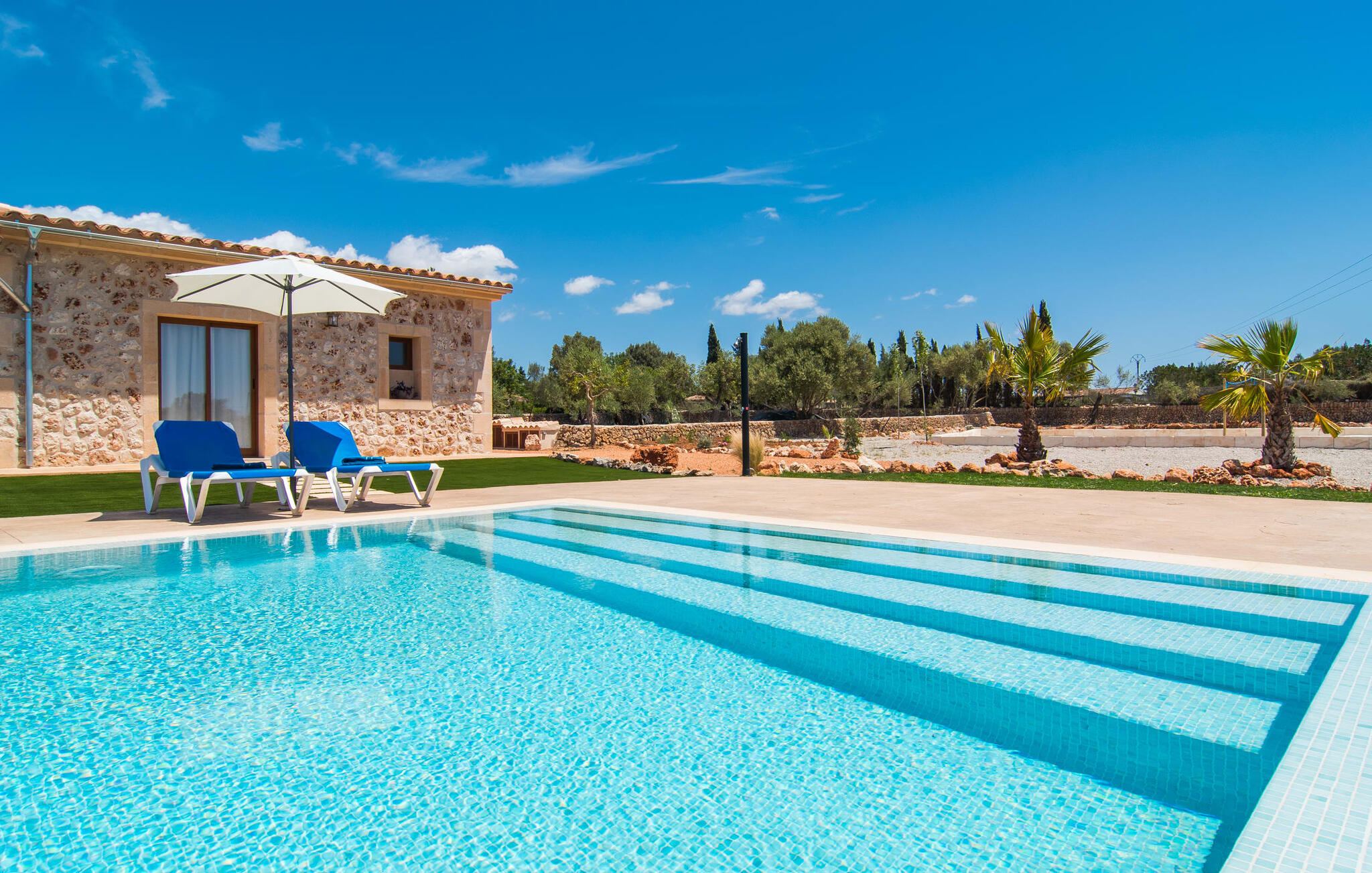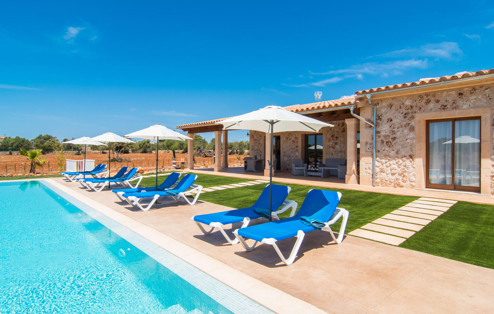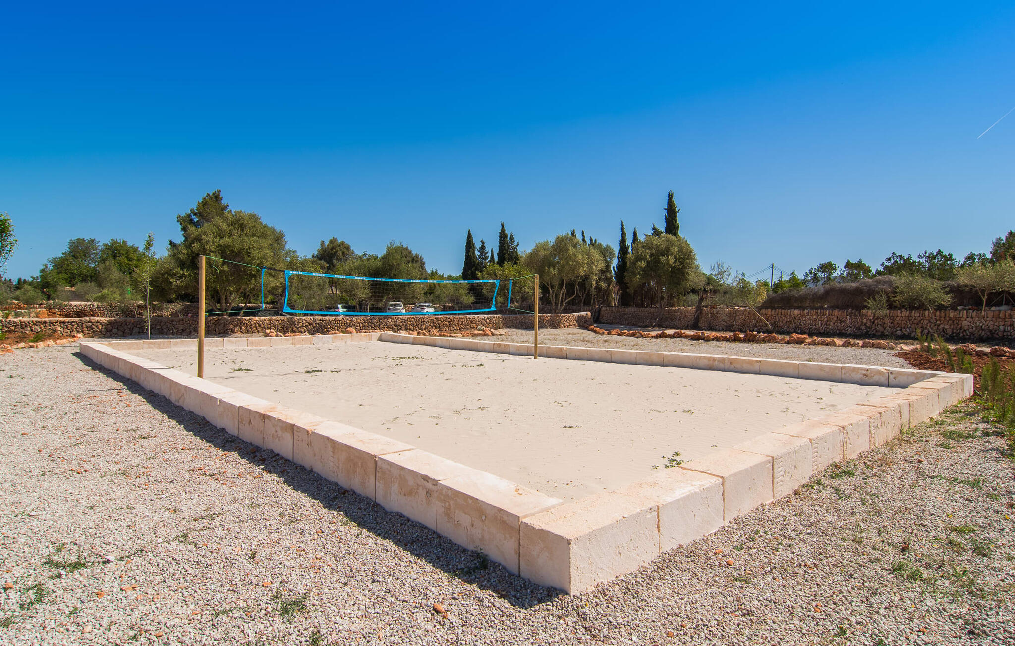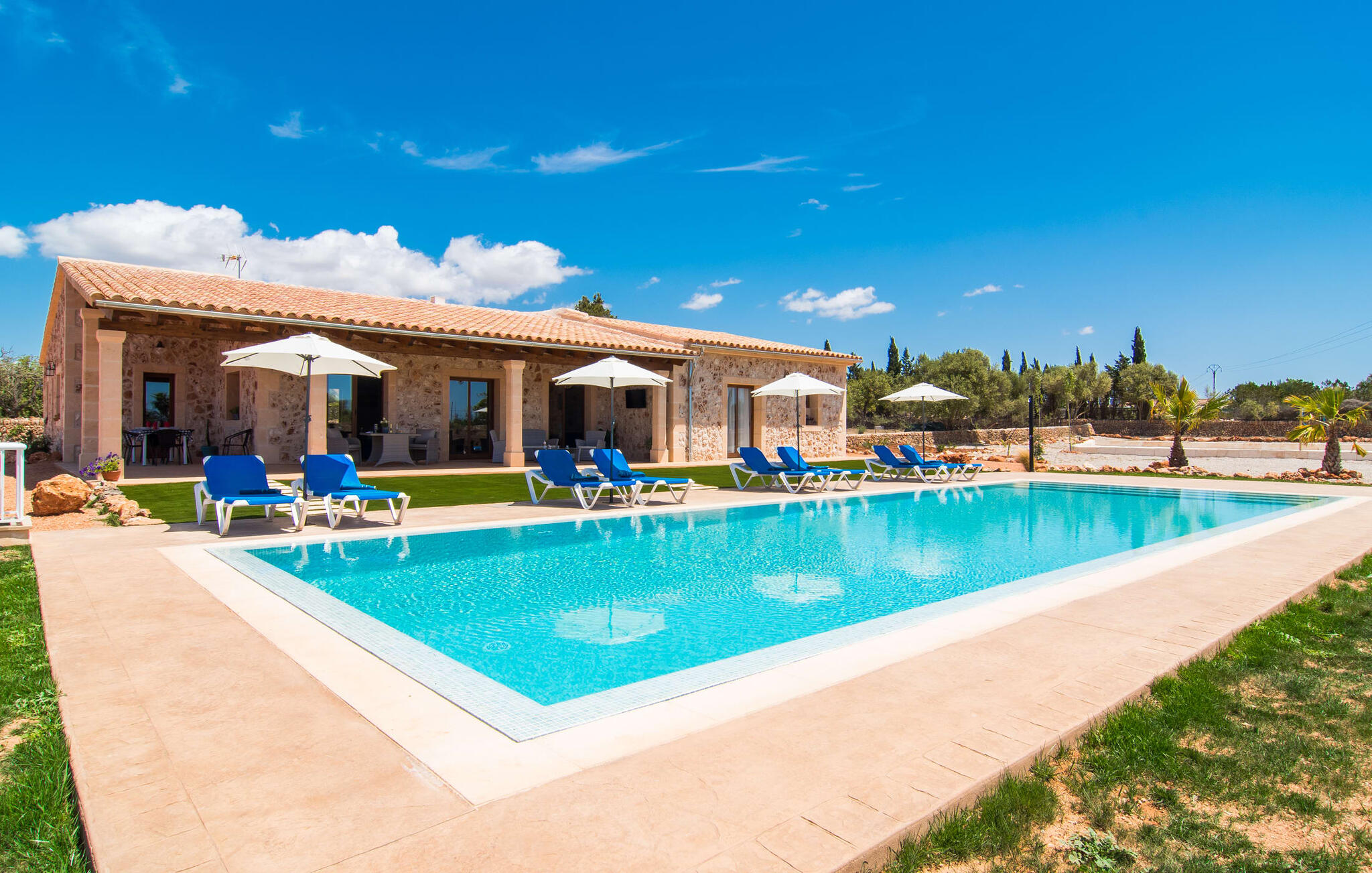 Heerlijk comfortabel en op een geweldige afgelegen locatie omgeven door groen: Villa Son Pieras Nou ligt op slechts een paar kilometer van Llucmajor. In deze prachtige hoek in het zuiden van Mallorca zijn er geen buren of auto`s in zicht: hier kun je genieten van absolute rust en stilte midden in de natuur en naar hartenlust tot rust komen. Het nieuw gebouwde natuurstenen huis ligt op een perceel van 28.000 m² met gazons en veel olijfbomen. Als je graag actief bezig bent, kun je gaan wandelen met je medereizigers of je uitleven met volleybal op het eigen volleybalveld van het huis. Daarna kun je afkoelen in het grote, rechthoekige zwembad met buitendouche, waar kinderen ook graag spetteren en zwemmen. Om een oogje in het zeil te houden, kunnen ouders neerstrijken op een van de comfortabele ligstoelen of in de schaduw zitten op het overdekte terras met verschillende uitnodigende zitjes.
