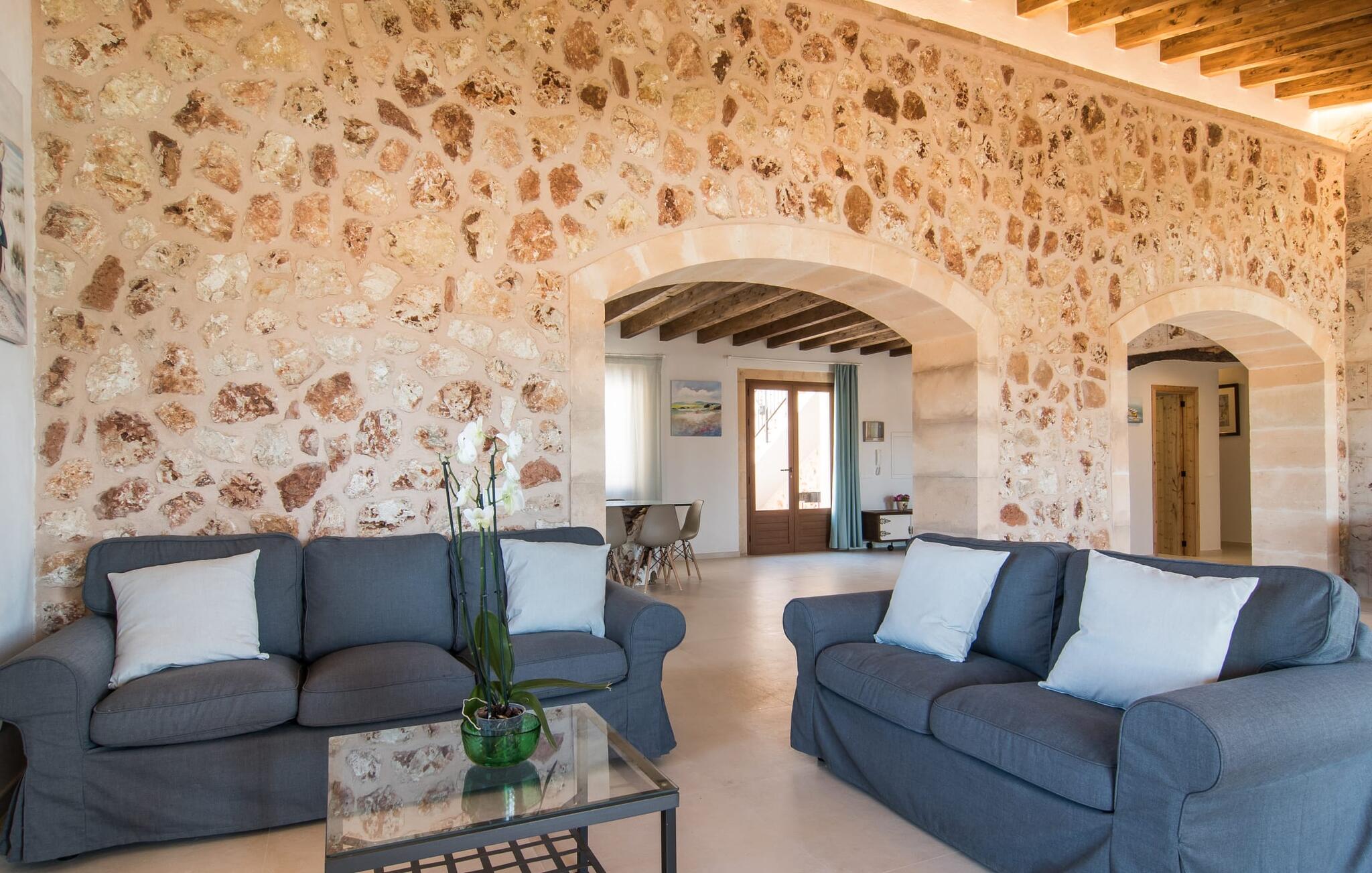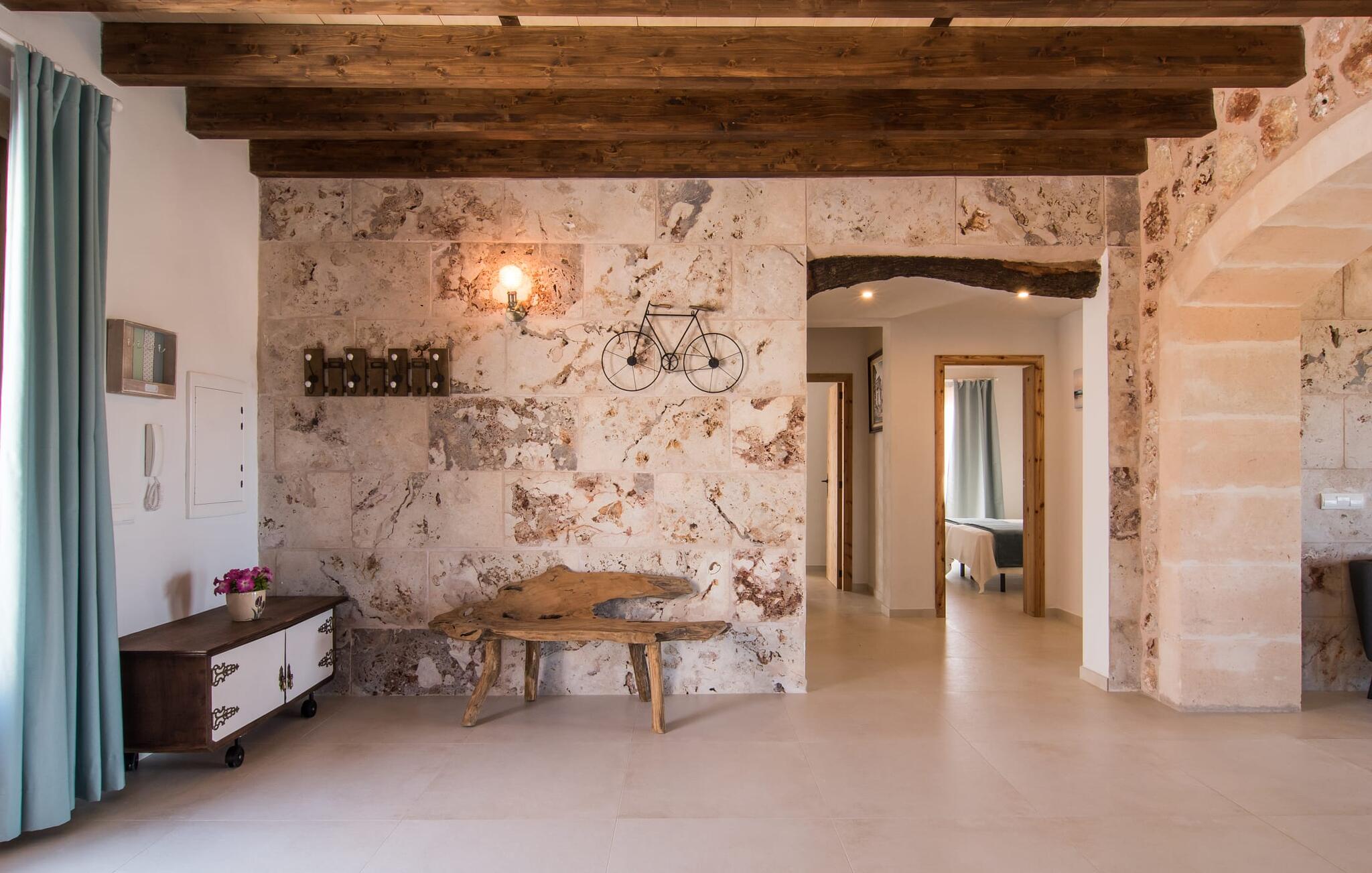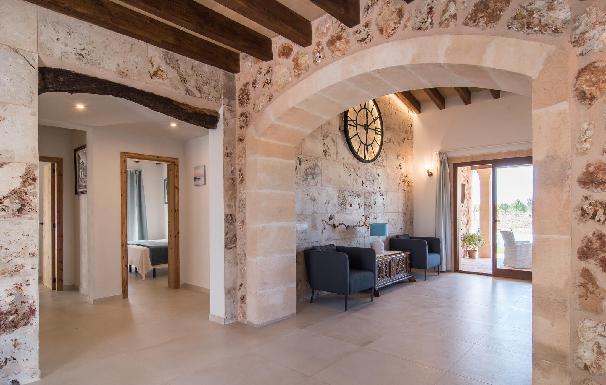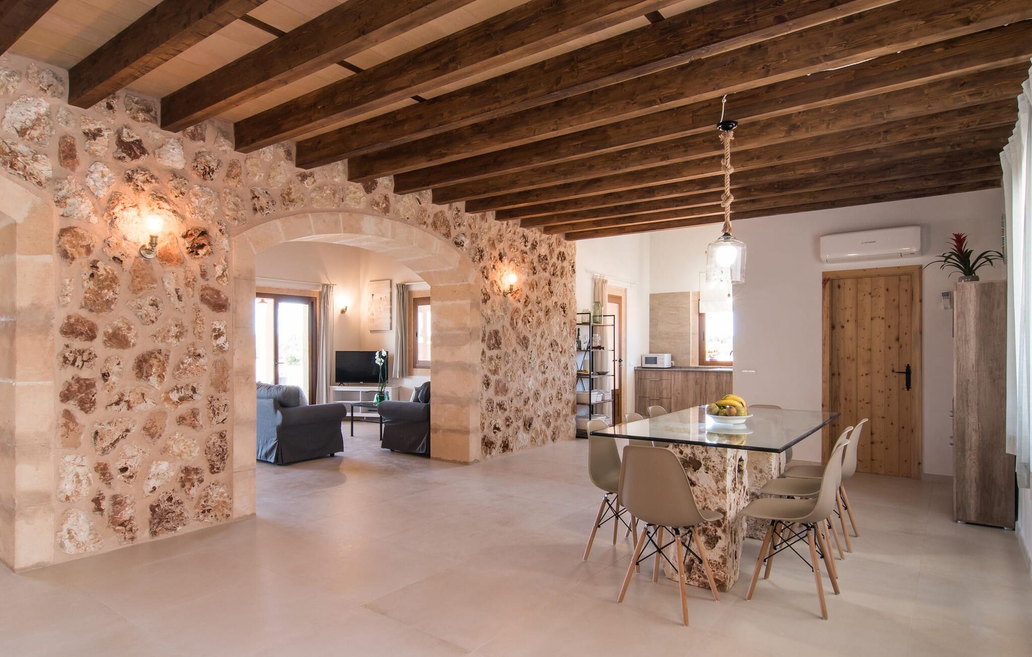 Het interieur van Son Pieras Nou is ontworpen met een scherp oog voor smaakvolle details. Natuurlijke kleuren overheersen, witgeschilderde muren worden afgewisseld met rustieke natuurstenen muren, de plafonds zijn voorzien van prachtige donkerbruine houten balken en de vloer is betegeld in een mooie lichtbruine kleur. Dit alles creëert een aangenaam ontspannen, landelijke vakantiesfeer. De afwezigheid van trappen is een architectonisch hoogtepunt: In de gelijkvloerse villa bevinden alle kamers zich op één niveau. Bijvoorbeeld de ruime woonkamer met twee gezellige banken en meerdere fauteuils voor de tv of de eethoek die uitkomt in de keuken met een elegante tafel, designstoelen en sfeervolle verlichting. Een ander hoogtepunt is de ultrachique keuken, waarvan de stijl perfect past bij de rest van het huis en van waaruit je kunt genieten van het uitzicht naar buiten. De leefruimte wordt gecompleteerd door drie slaapkamers met airconditioning en twee moderne badkamers, waarvan één en-suite.