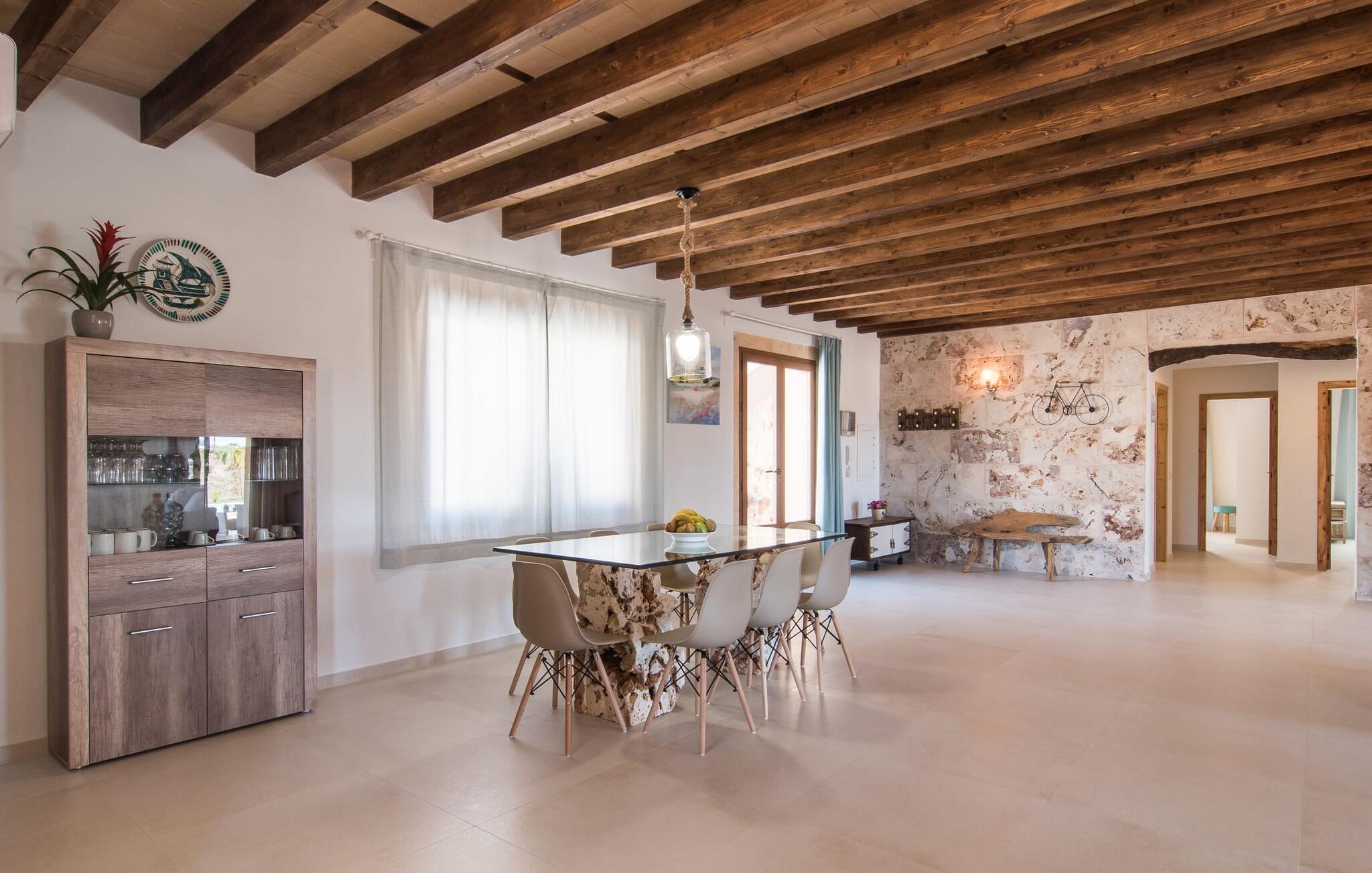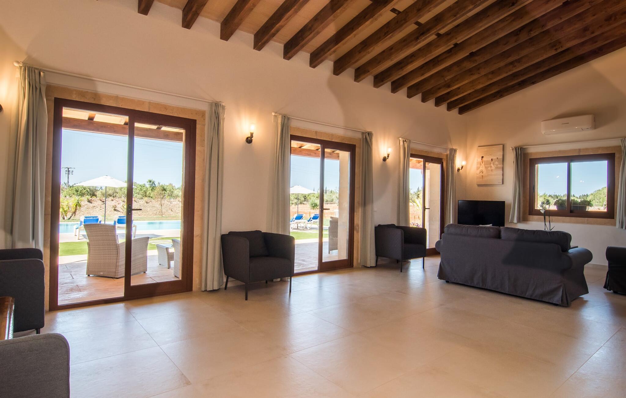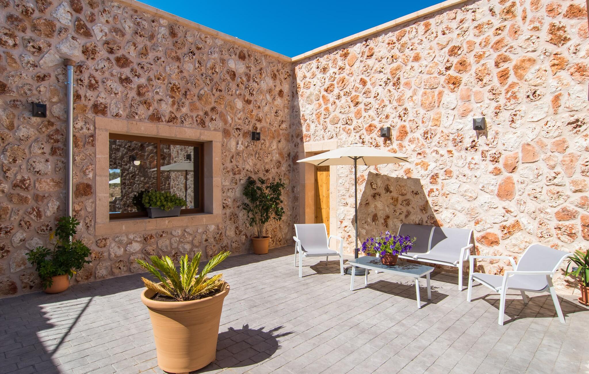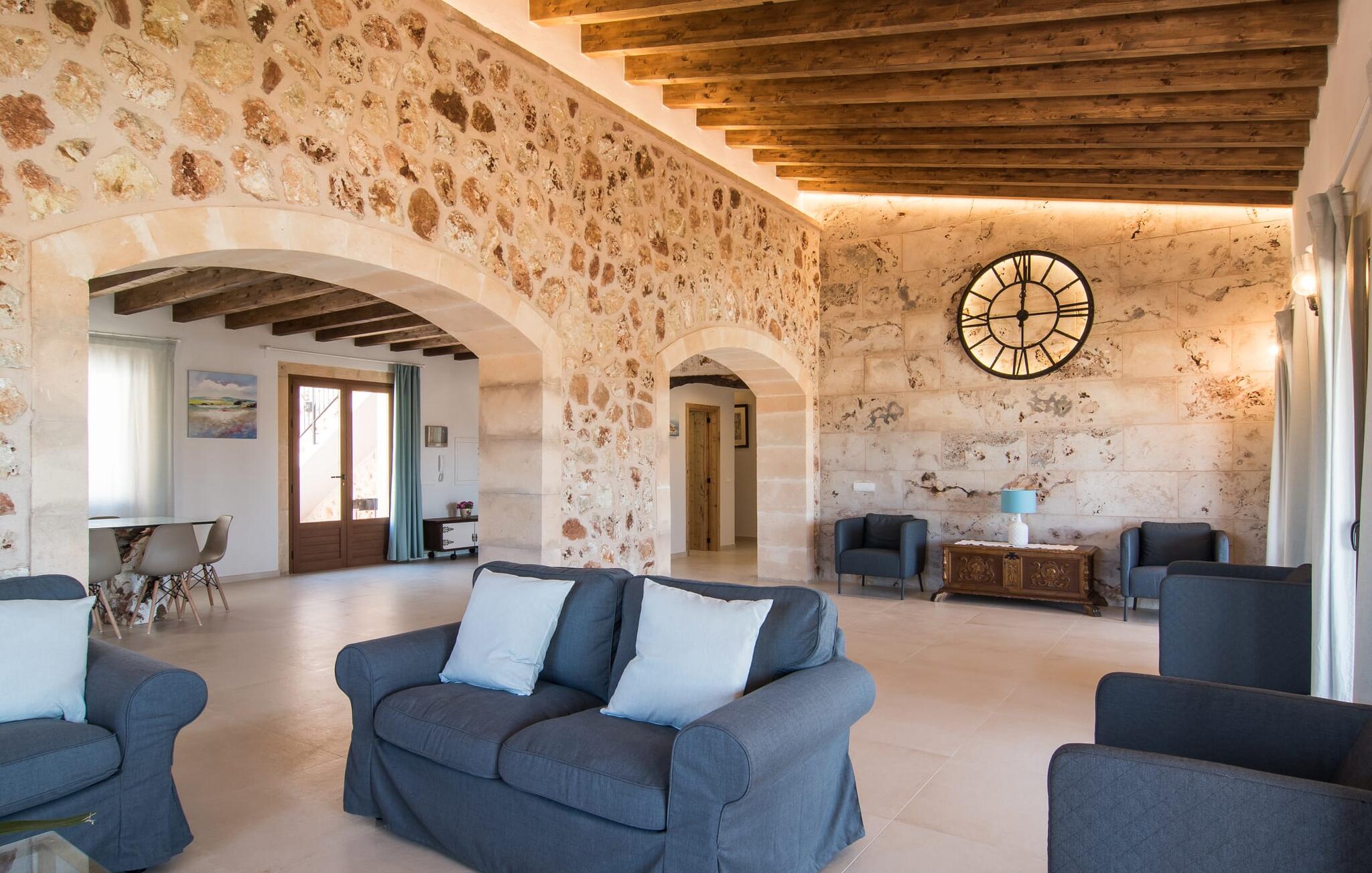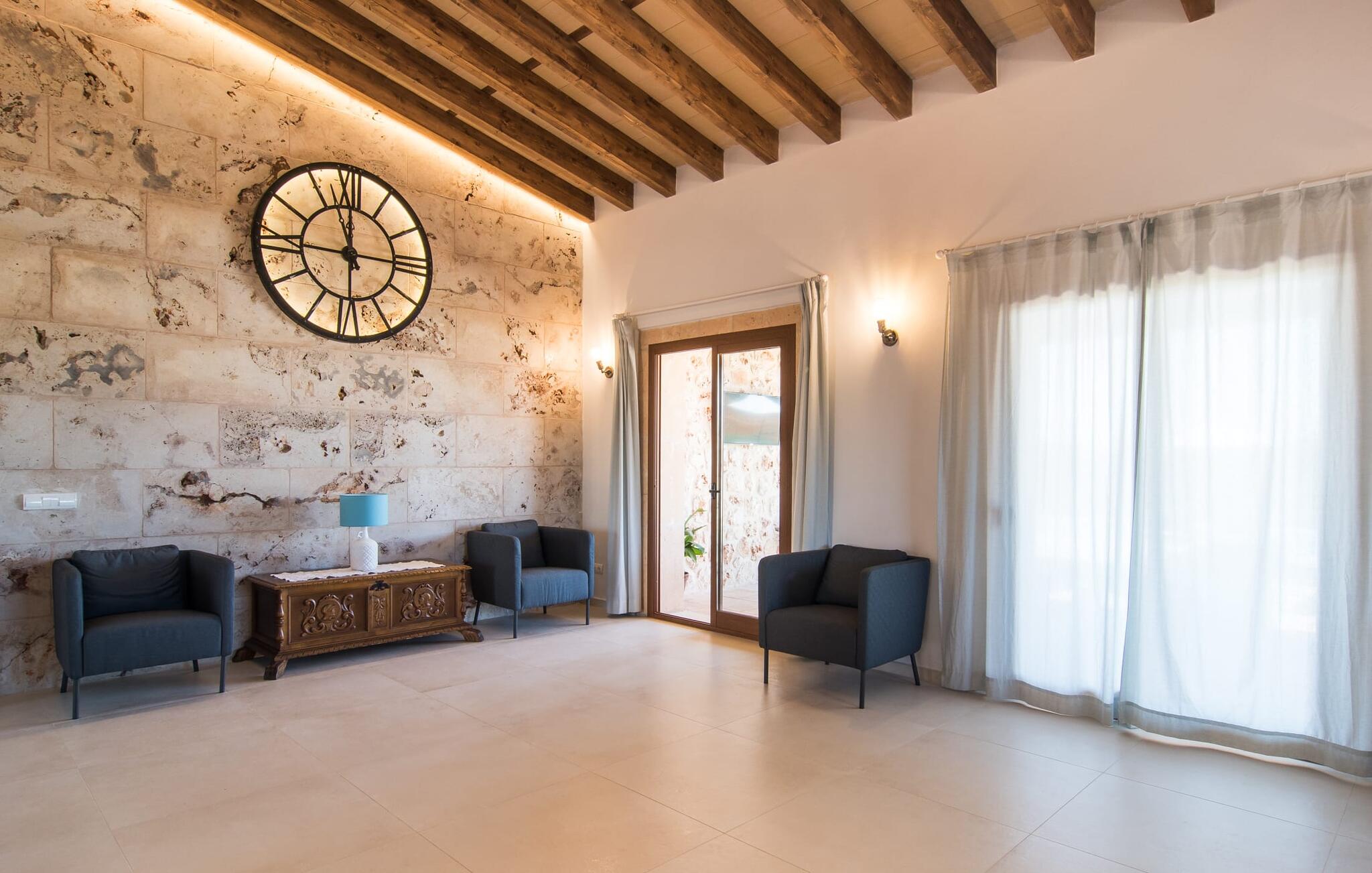 Het interieur van Son Pieras Nou is ontworpen met een scherp oog voor smaakvolle details. Natuurlijke kleuren overheersen, witgeschilderde muren worden afgewisseld met rustieke natuurstenen muren, de plafonds zijn voorzien van prachtige donkerbruine houten balken en de vloer is betegeld in een mooie lichtbruine kleur. Dit alles creëert een aangenaam ontspannen, landelijke vakantiesfeer. De afwezigheid van trappen is een architectonisch hoogtepunt: In de gelijkvloerse villa bevinden alle kamers zich op één niveau. Bijvoorbeeld de ruime woonkamer met twee gezellige banken en meerdere fauteuils voor de tv of de eethoek die uitkomt in de keuken met een elegante tafel, designstoelen en sfeervolle verlichting. Een ander hoogtepunt is de ultrachique keuken, waarvan de stijl perfect past bij de rest van het huis en van waaruit je kunt genieten van het uitzicht naar buiten. De leefruimte wordt gecompleteerd door drie slaapkamers met airconditioning en twee moderne badkamers, waarvan één en-suite.