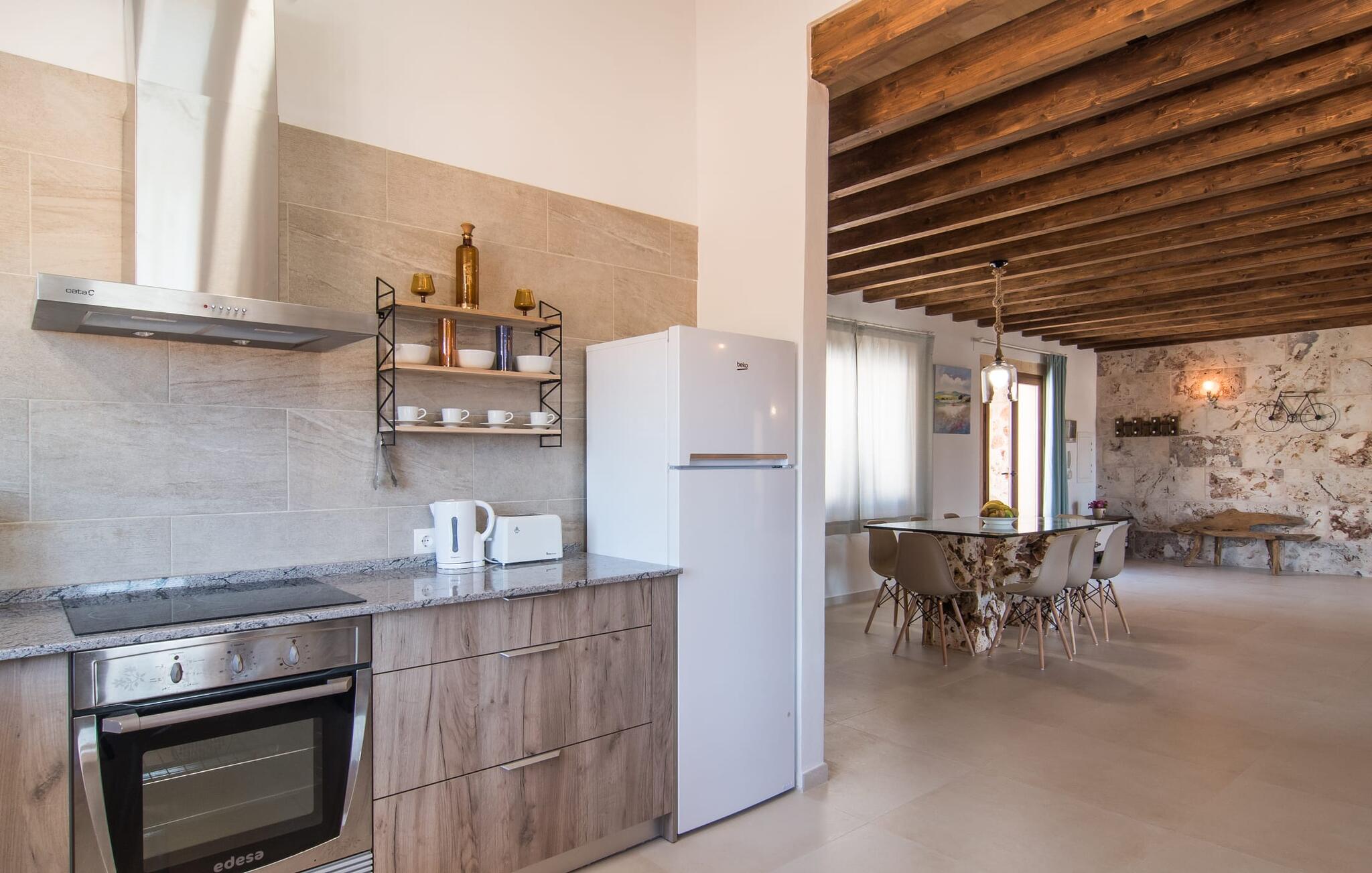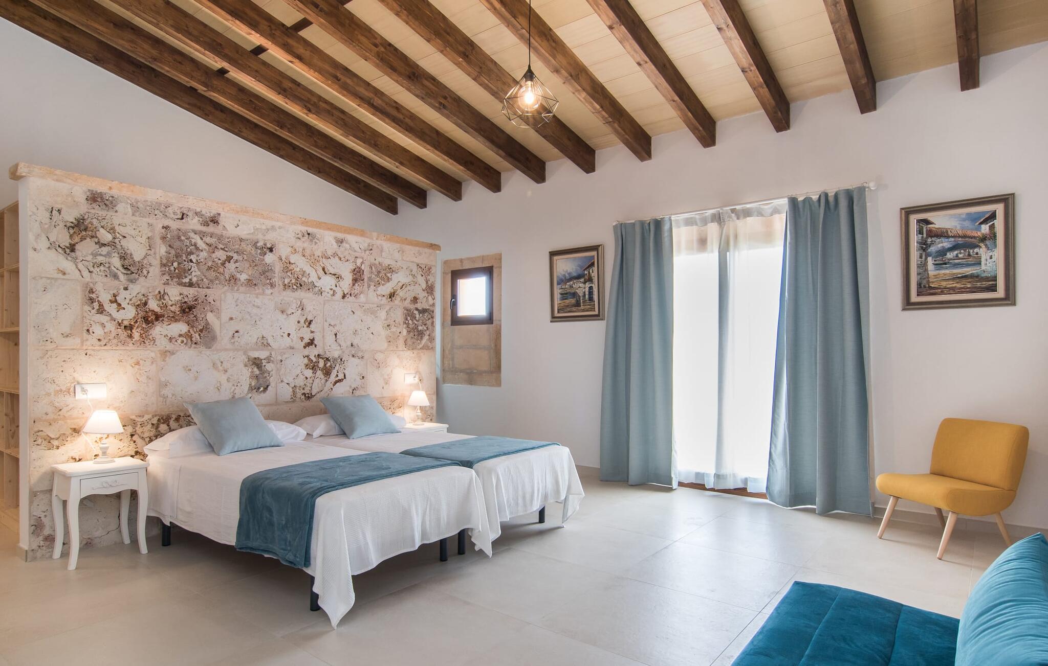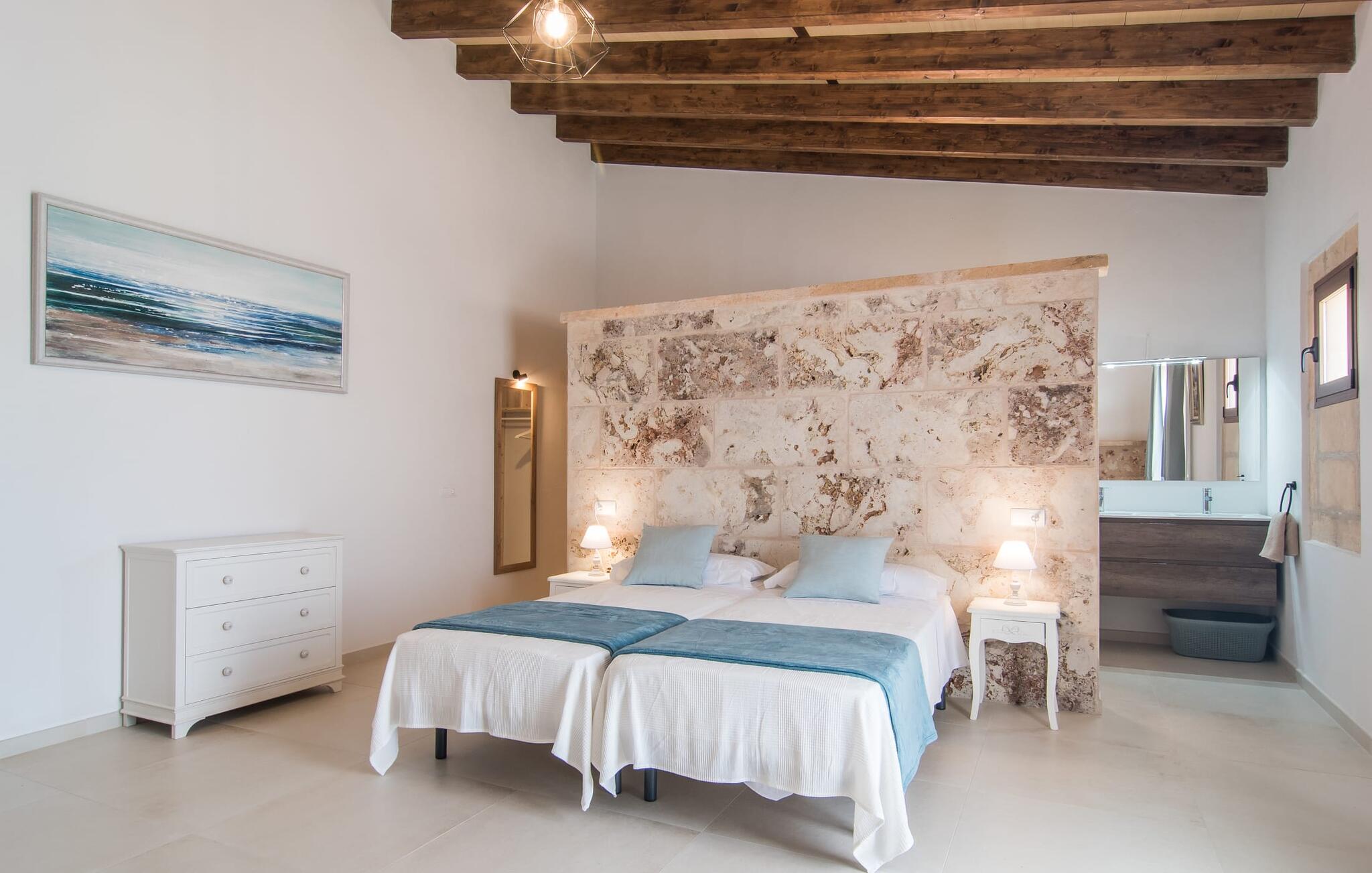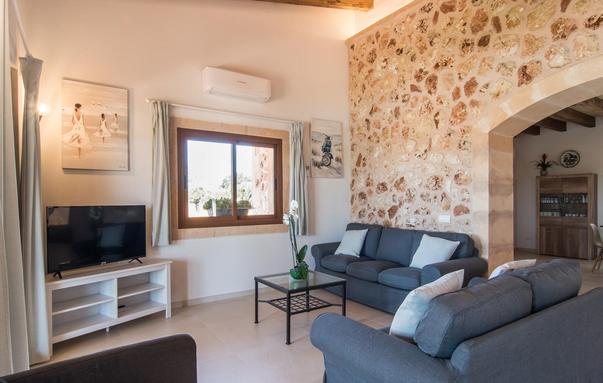Het interieur van Son Pieras Nou is ontworpen met een scherp oog voor smaakvolle details. Natuurlijke kleuren overheersen, witgeschilderde muren worden afgewisseld met rustieke natuurstenen muren, de plafonds zijn voorzien van prachtige donkerbruine houten balken en de vloer is betegeld in een mooie lichtbruine kleur. Dit alles creëert een aangenaam ontspannen, landelijke vakantiesfeer. De afwezigheid van trappen is een architectonisch hoogtepunt: In de gelijkvloerse villa bevinden alle kamers zich op één niveau. Bijvoorbeeld de ruime woonkamer met twee gezellige banken en meerdere fauteuils voor de tv of de eethoek die uitkomt in de keuken met een elegante tafel, designstoelen en sfeervolle verlichting. Een ander hoogtepunt is de ultrachique keuken, waarvan de stijl perfect past bij de rest van het huis en van waaruit je kunt genieten van het uitzicht naar buiten. De leefruimte wordt gecompleteerd door drie slaapkamers met airconditioning en twee moderne badkamers, waarvan één en-suite.