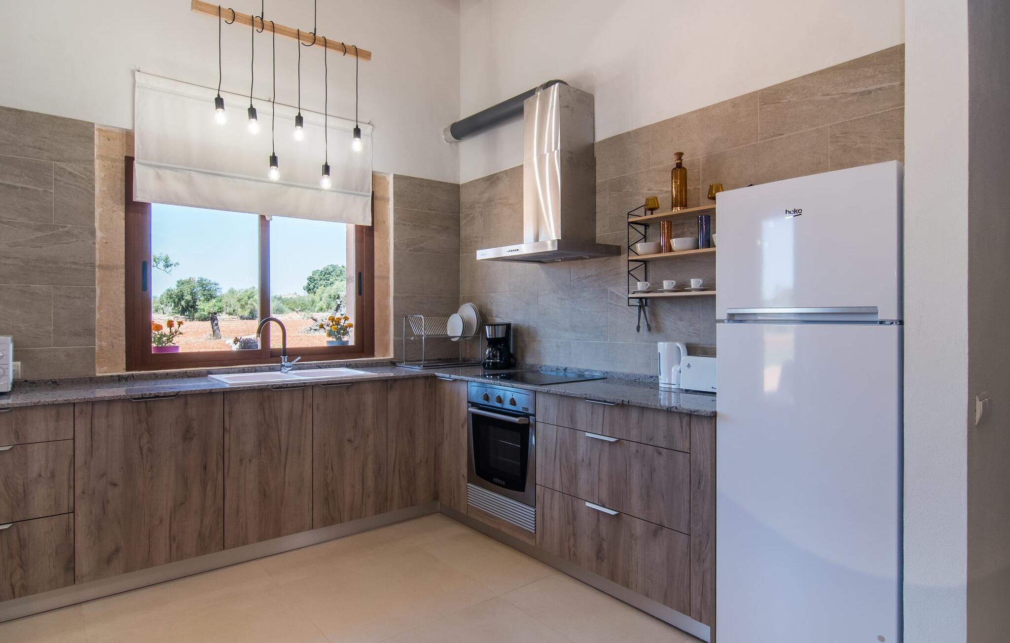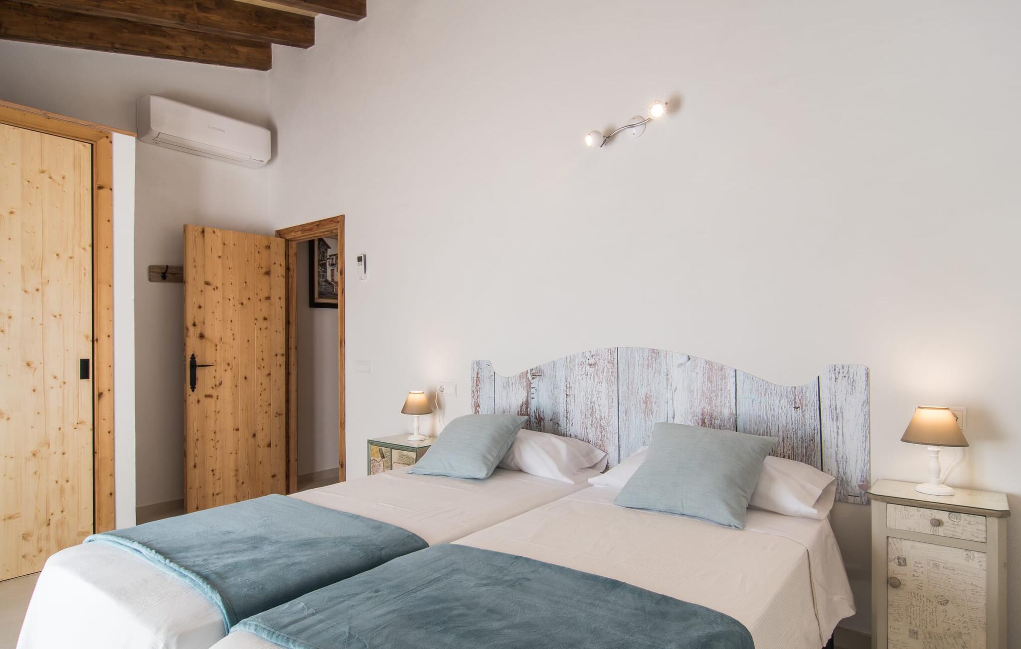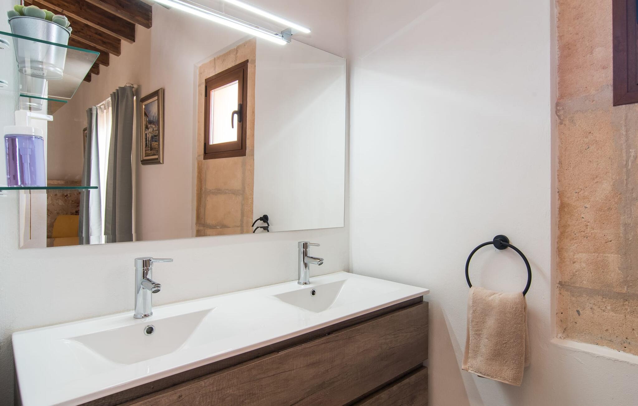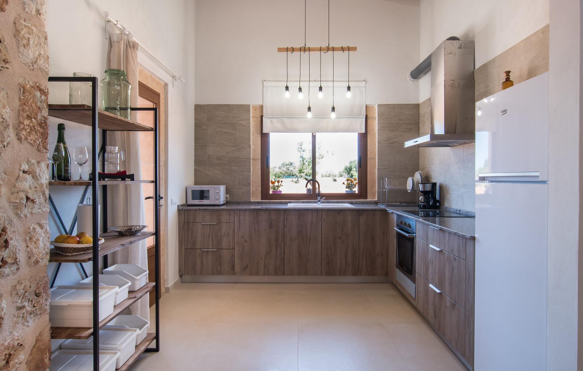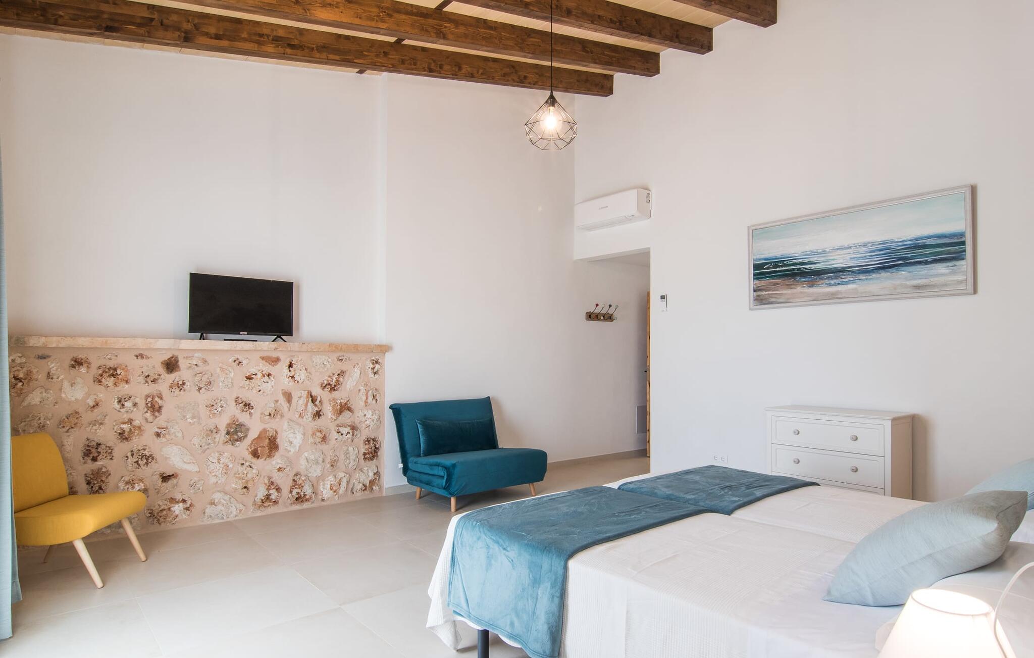 Het interieur van Son Pieras Nou is ontworpen met een scherp oog voor smaakvolle details. Natuurlijke kleuren overheersen, witgeschilderde muren worden afgewisseld met rustieke natuurstenen muren, de plafonds zijn voorzien van prachtige donkerbruine houten balken en de vloer is betegeld in een mooie lichtbruine kleur. Dit alles creëert een aangenaam ontspannen, landelijke vakantiesfeer. De afwezigheid van trappen is een architectonisch hoogtepunt: In de gelijkvloerse villa bevinden alle kamers zich op één niveau. Bijvoorbeeld de ruime woonkamer met twee gezellige banken en meerdere fauteuils voor de tv of de eethoek die uitkomt in de keuken met een elegante tafel, designstoelen en sfeervolle verlichting. Een ander hoogtepunt is de ultrachique keuken, waarvan de stijl perfect past bij de rest van het huis en van waaruit je kunt genieten van het uitzicht naar buiten. De leefruimte wordt gecompleteerd door drie slaapkamers met airconditioning en twee moderne badkamers, waarvan één en-suite.