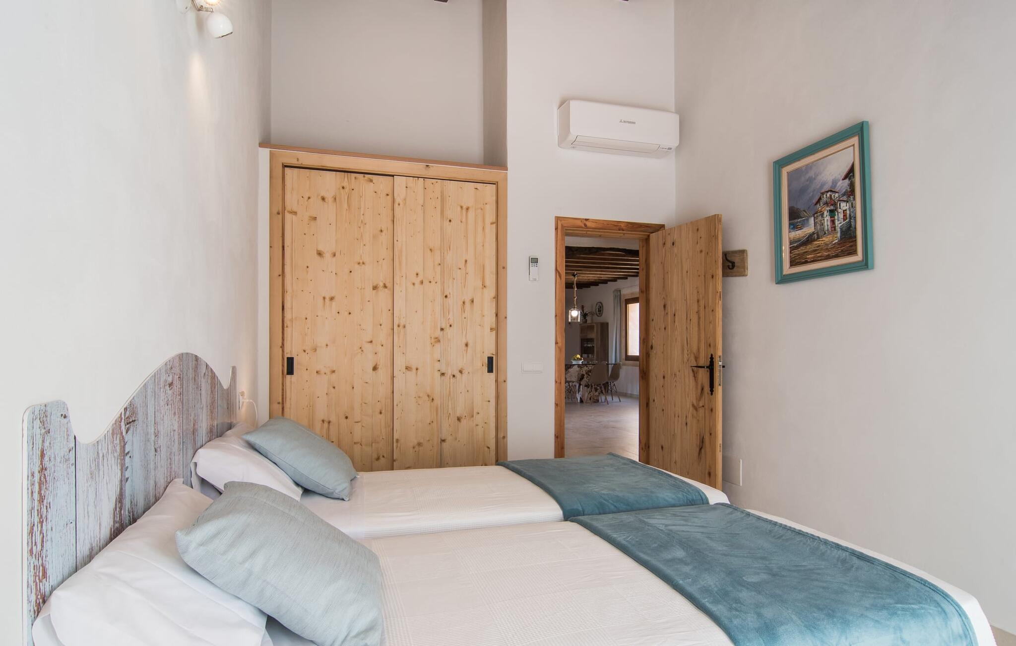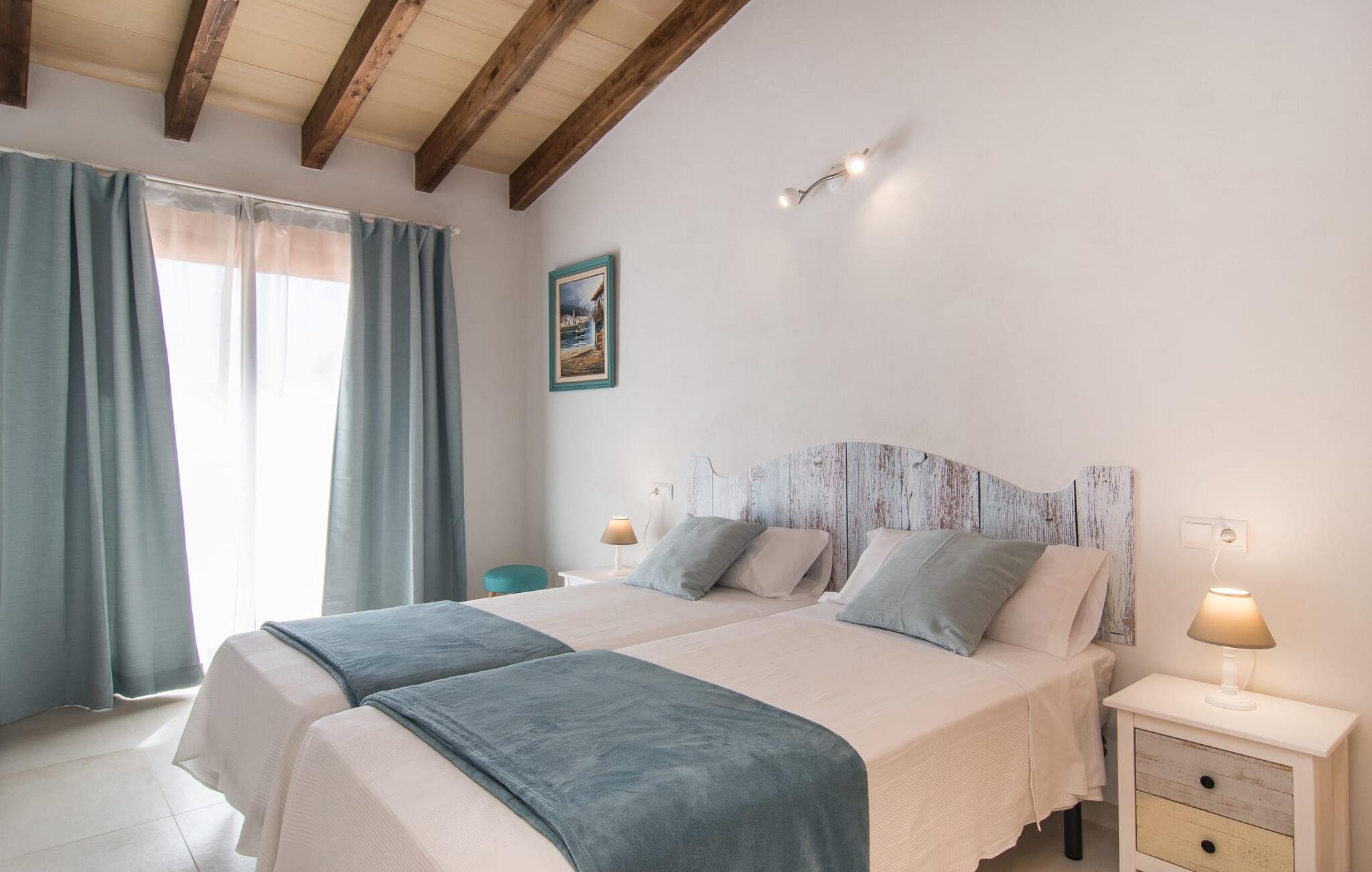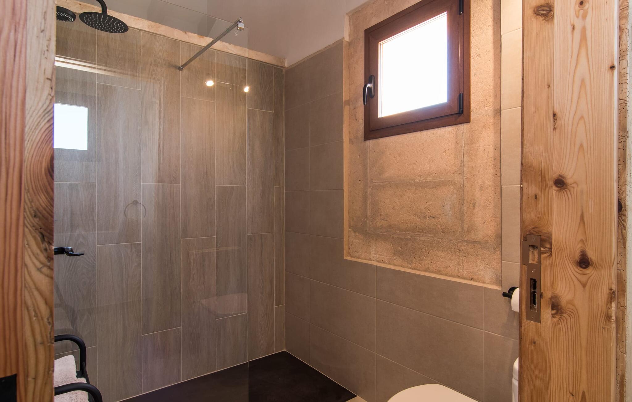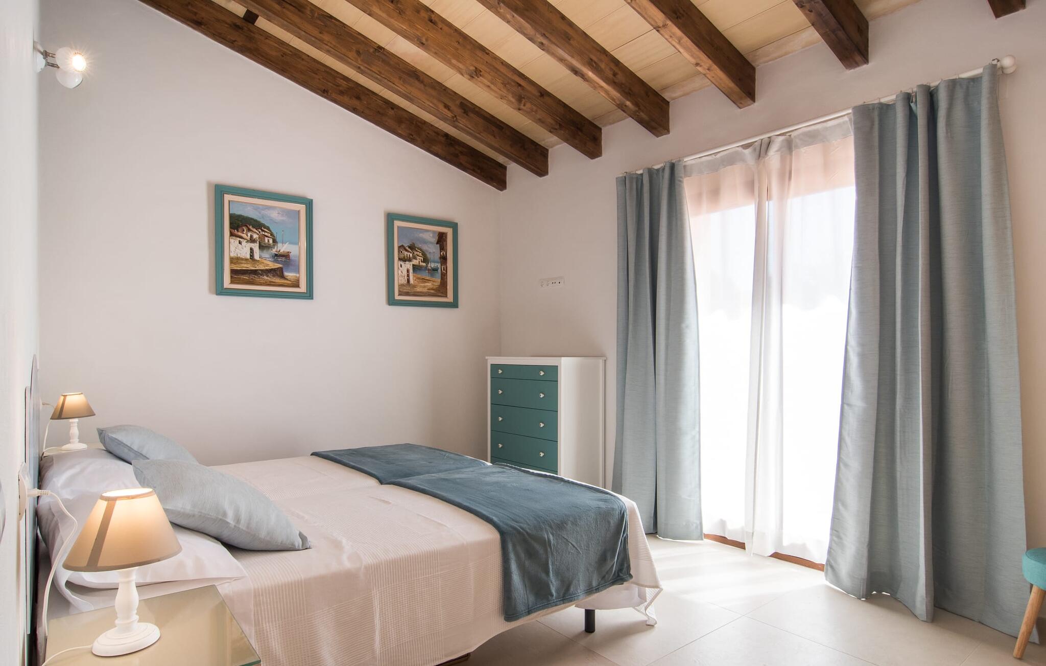 Het interieur van Son Pieras Nou is ontworpen met een scherp oog voor smaakvolle details. Natuurlijke kleuren overheersen, witgeschilderde muren worden afgewisseld met rustieke natuurstenen muren, de plafonds zijn voorzien van prachtige donkerbruine houten balken en de vloer is betegeld in een mooie lichtbruine kleur. Dit alles creëert een aangenaam ontspannen, landelijke vakantiesfeer. De afwezigheid van trappen is een architectonisch hoogtepunt: In de gelijkvloerse villa bevinden alle kamers zich op één niveau. Bijvoorbeeld de ruime woonkamer met twee gezellige banken en meerdere fauteuils voor de tv of de eethoek die uitkomt in de keuken met een elegante tafel, designstoelen en sfeervolle verlichting. Een ander hoogtepunt is de ultrachique keuken, waarvan de stijl perfect past bij de rest van het huis en van waaruit je kunt genieten van het uitzicht naar buiten. De leefruimte wordt gecompleteerd door drie slaapkamers met airconditioning en twee moderne badkamers, waarvan één en-suite.