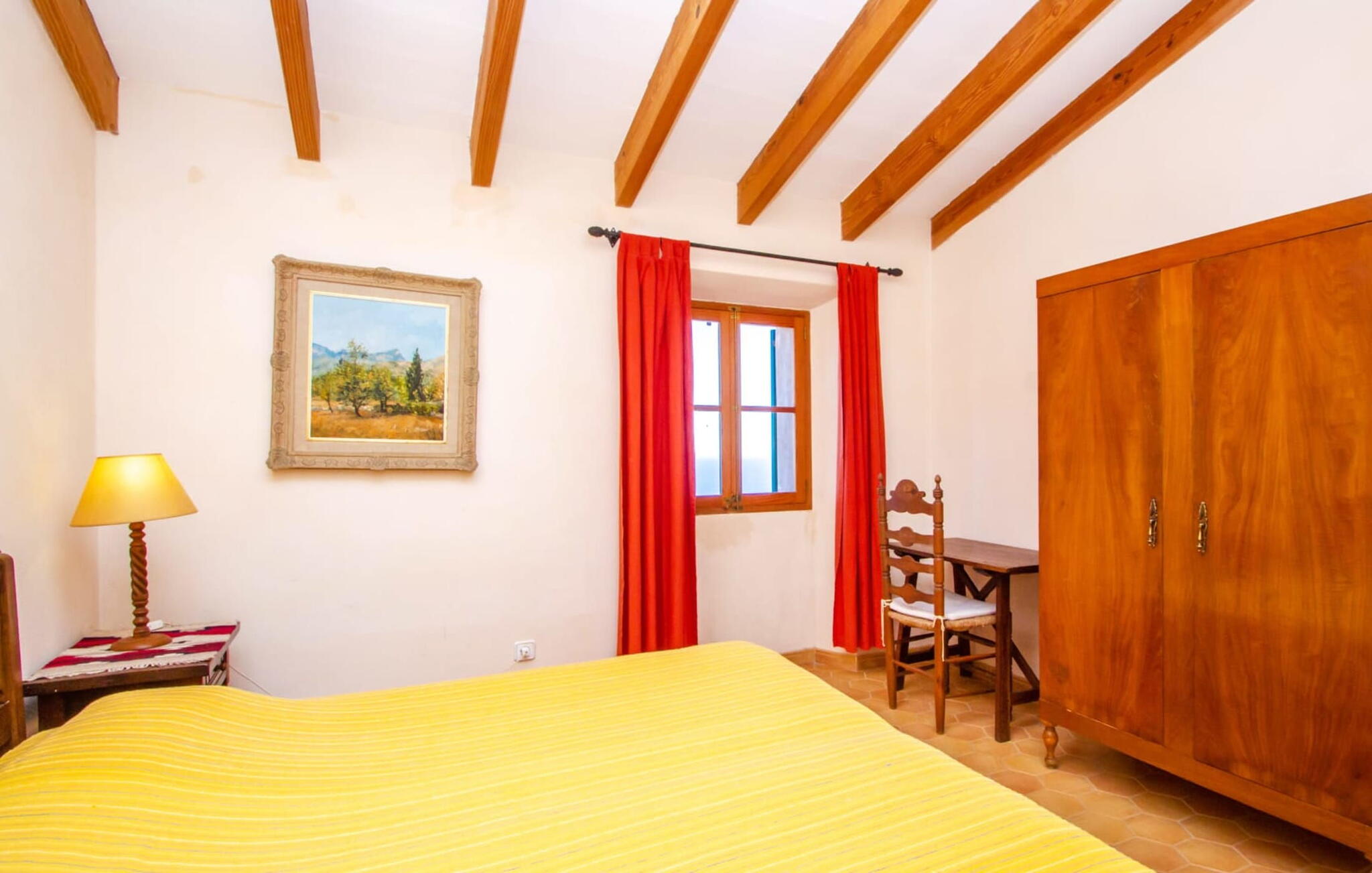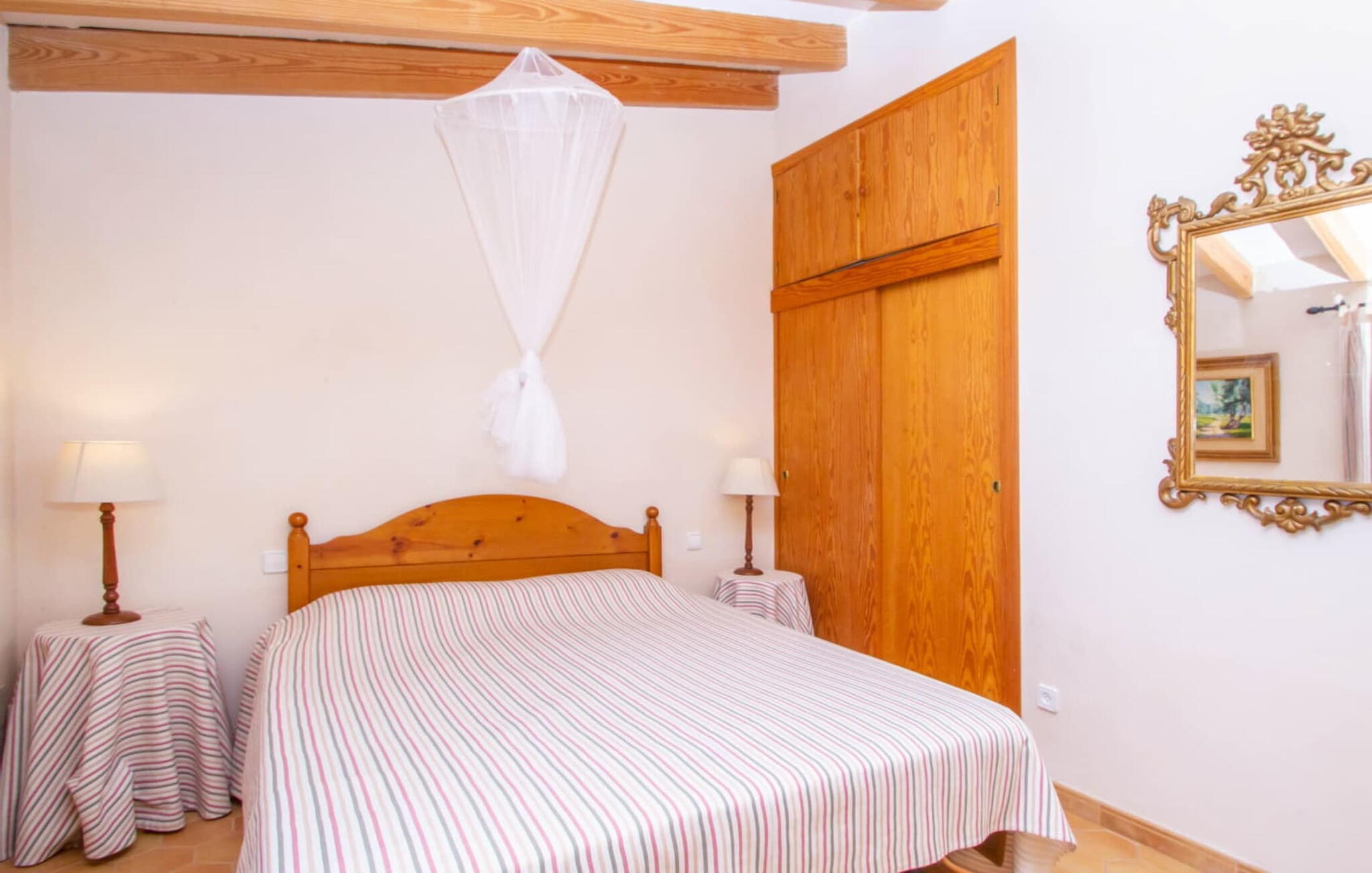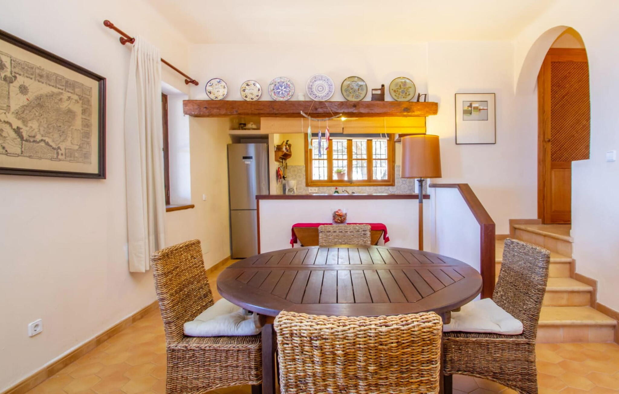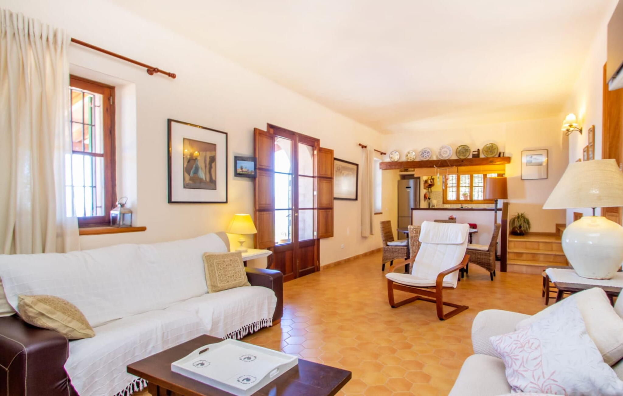 Het hoofdgebouw is verdeeld over twee verdiepingen en heeft twee comfortabele tweepersoonsslaapkamers, een badkamer met douche en een extra toilet. De open keuken is volledig uitgerust en de woon/eetkamer biedt de perfecte plek om te ontspannen. Een bijgebouw met een aparte ingang biedt extra leefruimte, een ruime tweepersoonsslaapkamer met en-suite badkamer en is ideaal voor groepen die op zoek zijn naar privacy. De airconditioning zorgt voor comfort op warme zomeravonden, terwijl de inrichting de authentieke Mallorcaanse stijl weerspiegelt, perfect om jezelf onder te dompelen in de lokale cultuur.