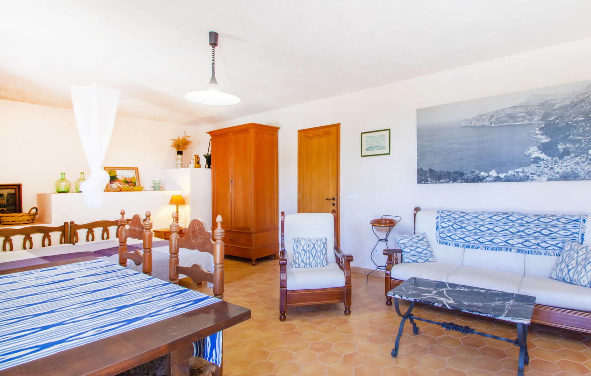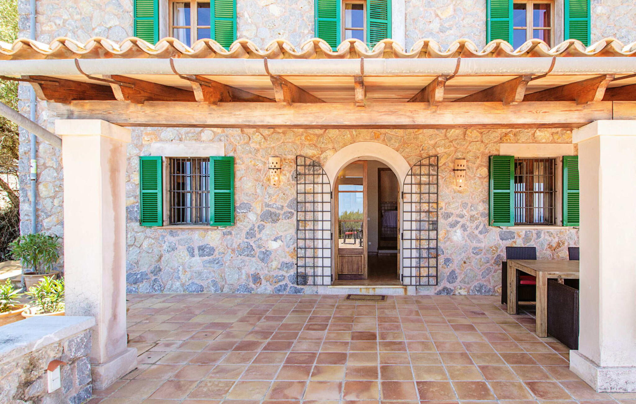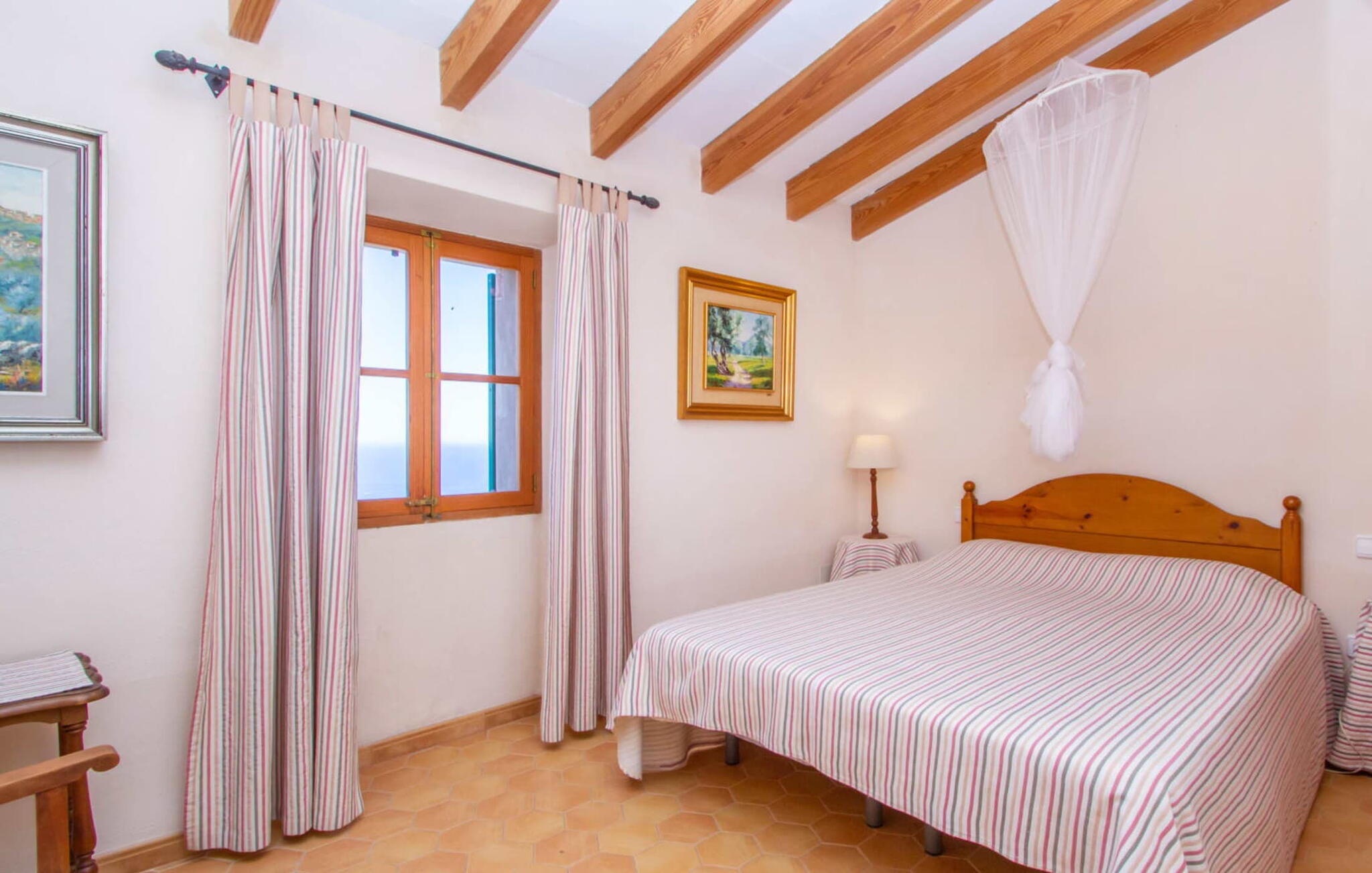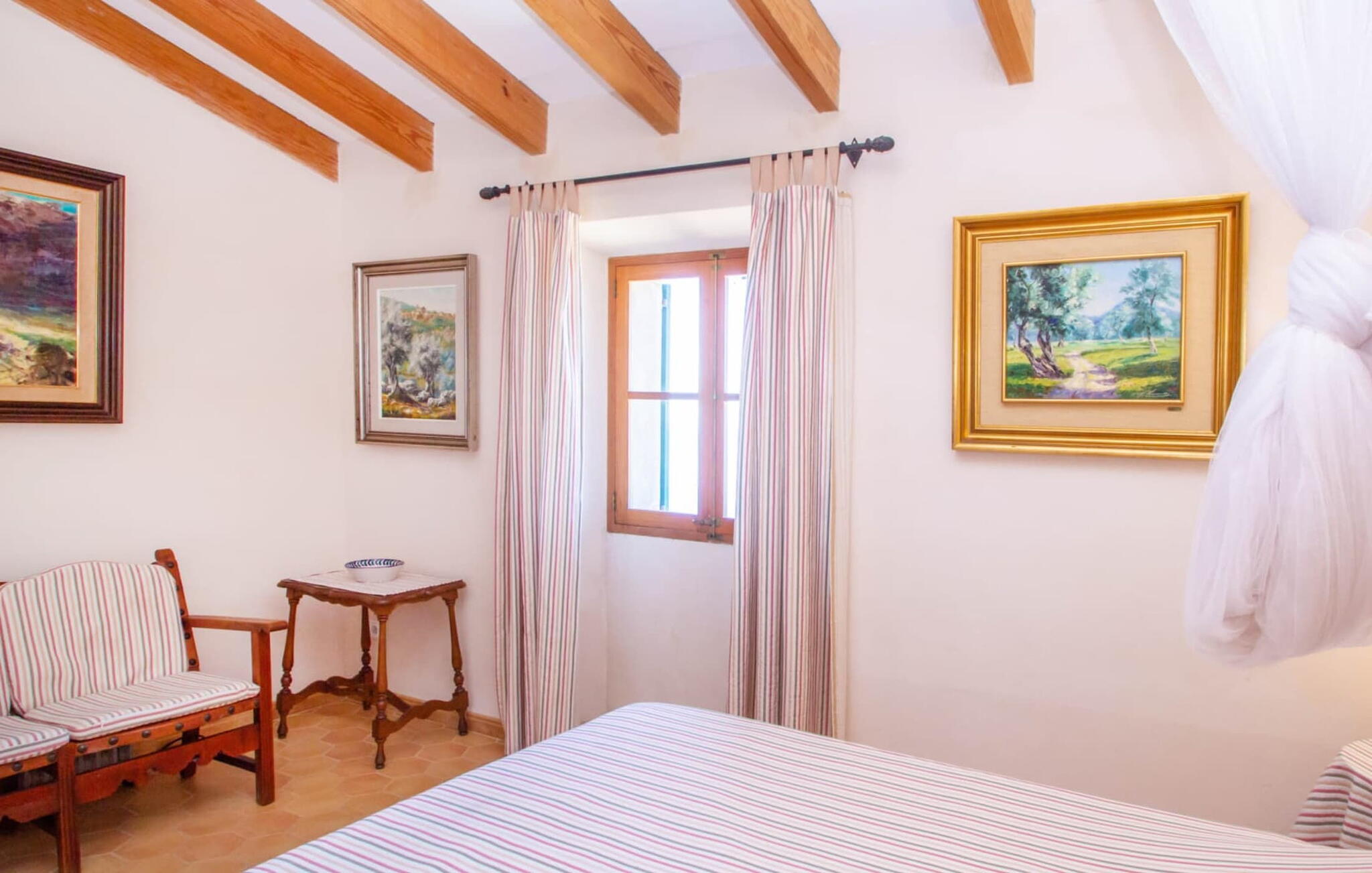 Het hoofdgebouw is verdeeld over twee verdiepingen en heeft twee comfortabele tweepersoonsslaapkamers, een badkamer met douche en een extra toilet. De open keuken is volledig uitgerust en de woon/eetkamer biedt de perfecte plek om te ontspannen. Een bijgebouw met een aparte ingang biedt extra leefruimte, een ruime tweepersoonsslaapkamer met en-suite badkamer en is ideaal voor groepen die op zoek zijn naar privacy. De airconditioning zorgt voor comfort op warme zomeravonden, terwijl de inrichting de authentieke Mallorcaanse stijl weerspiegelt, perfect om jezelf onder te dompelen in de lokale cultuur.