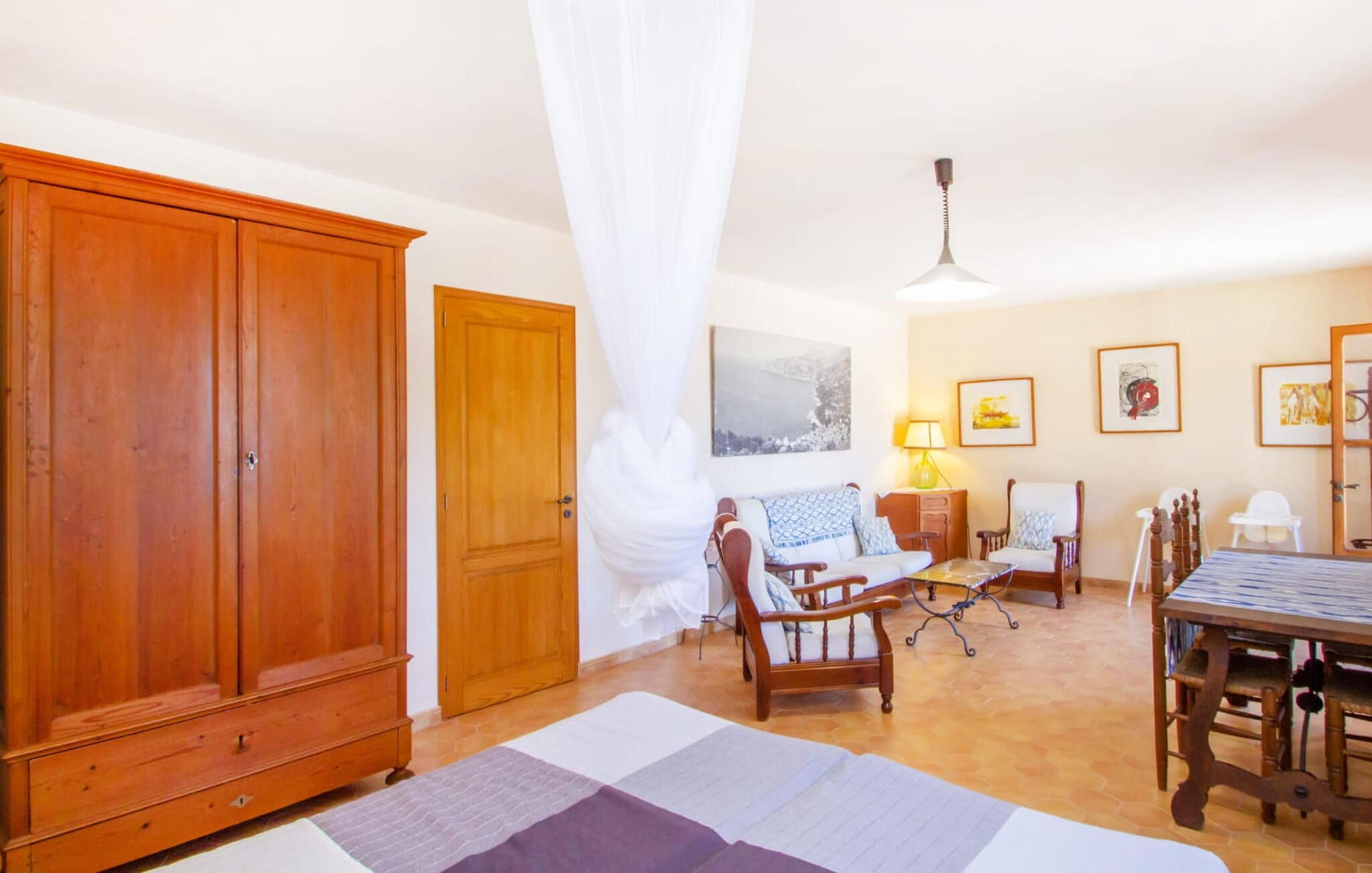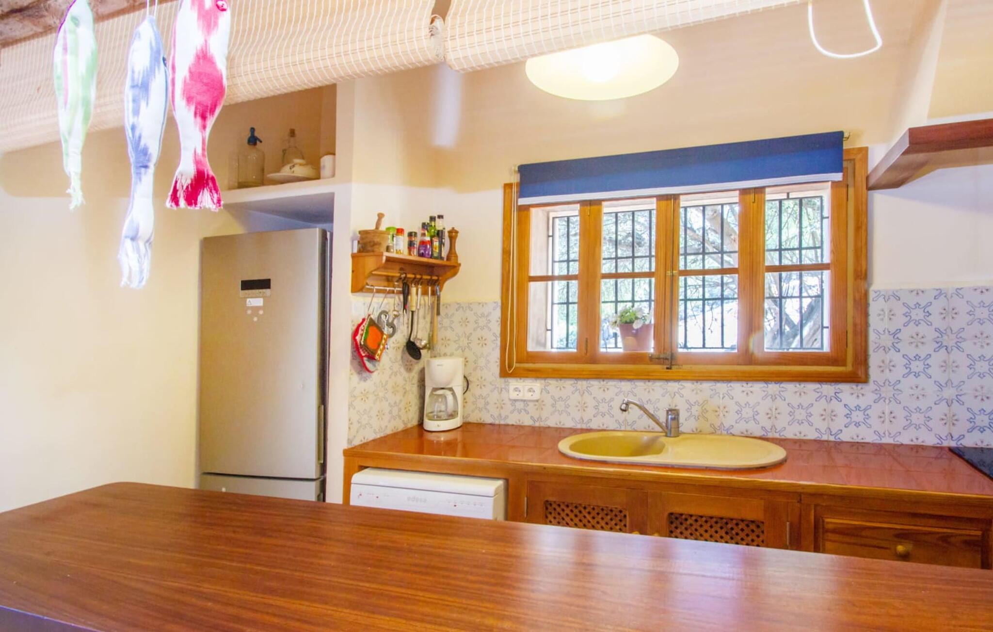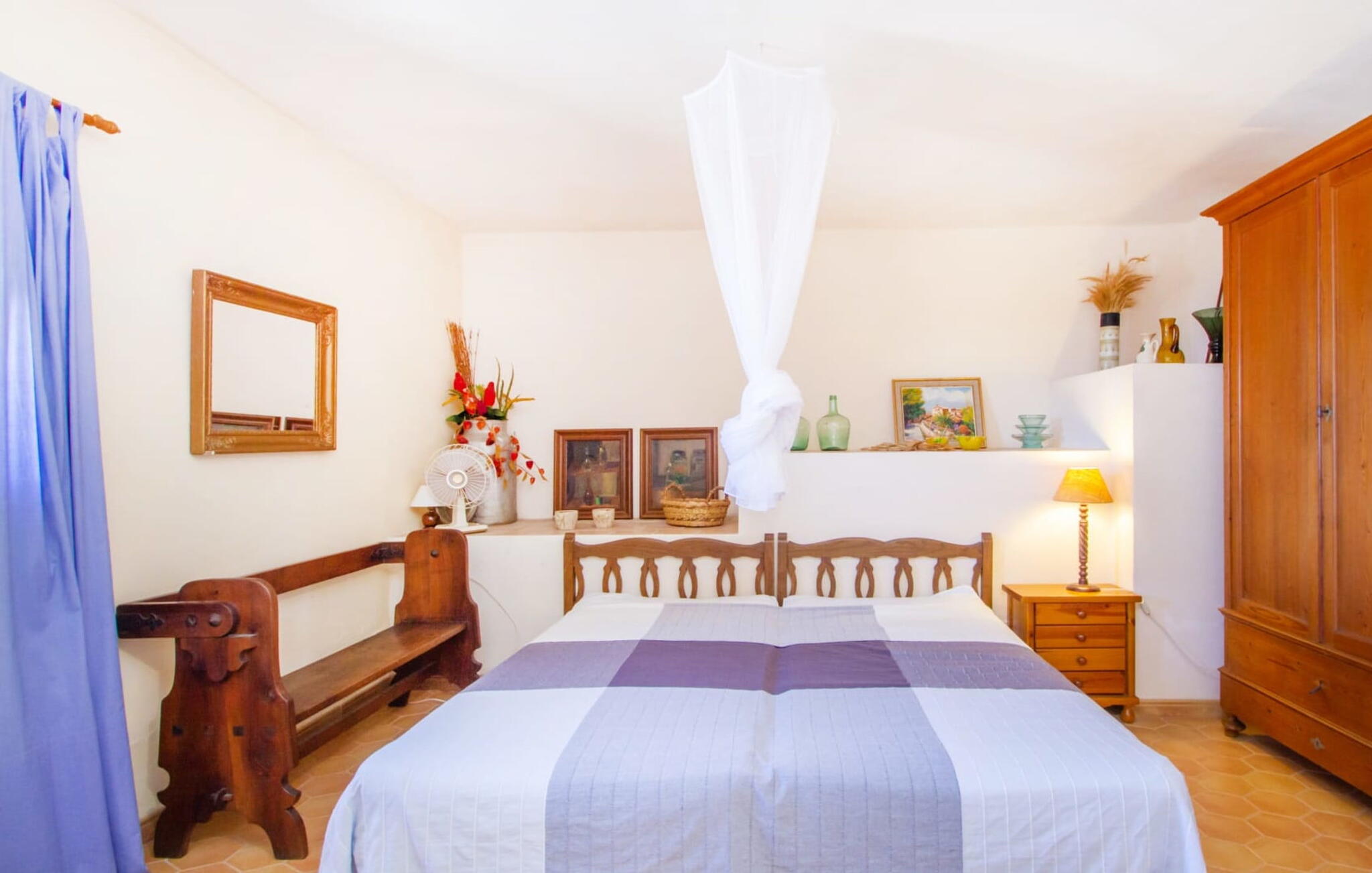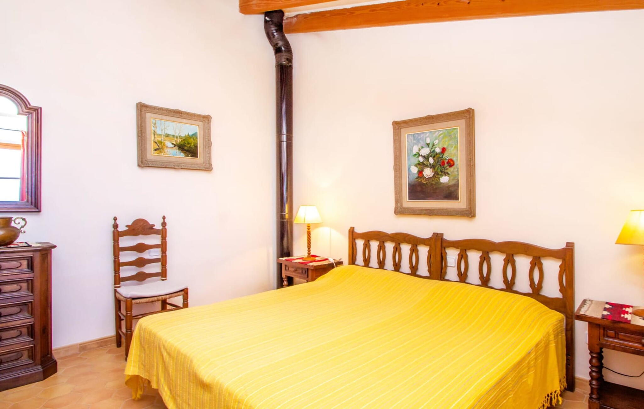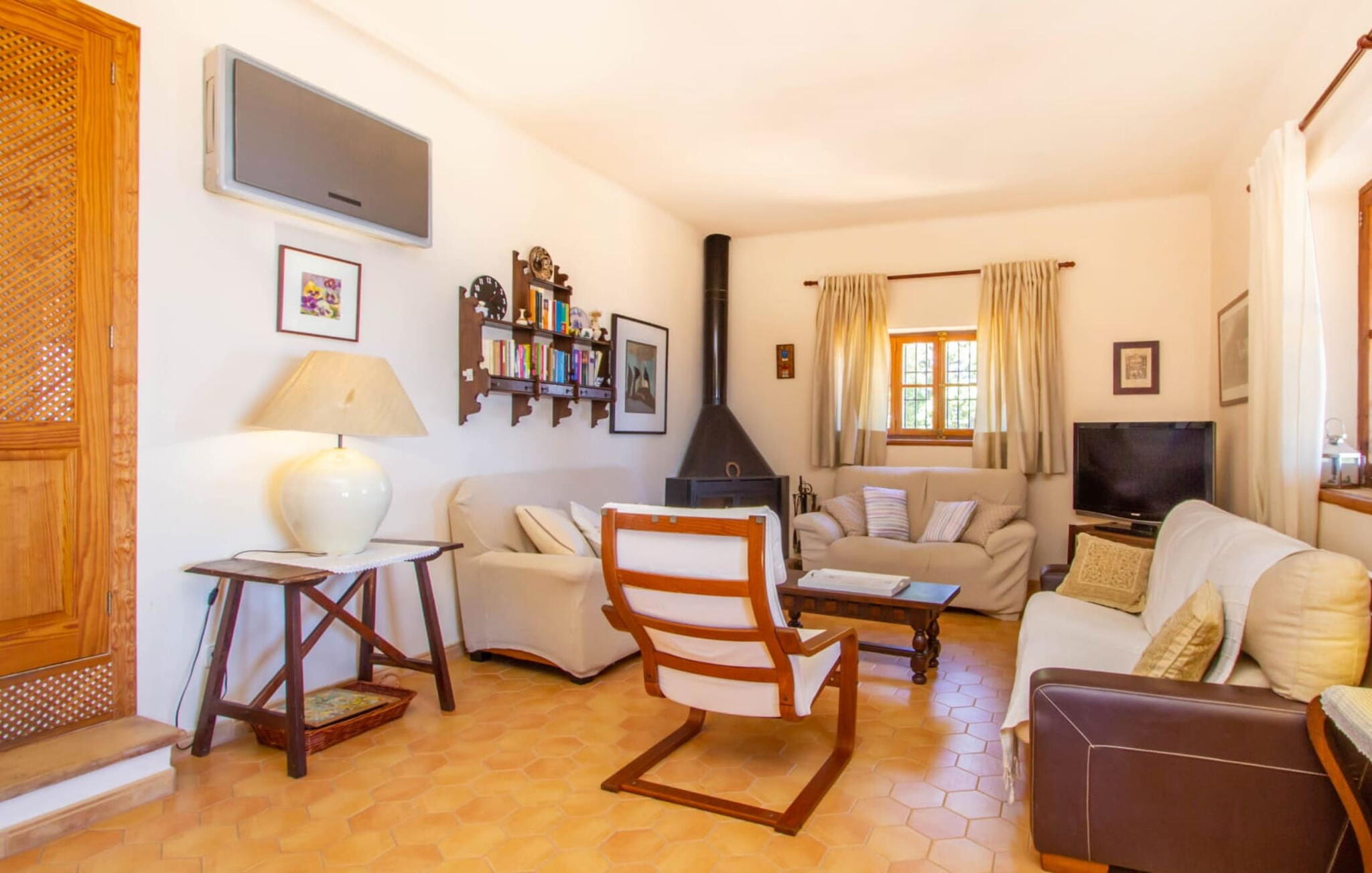 Het hoofdgebouw is verdeeld over twee verdiepingen en heeft twee comfortabele tweepersoonsslaapkamers, een badkamer met douche en een extra toilet. De open keuken is volledig uitgerust en de woon/eetkamer biedt de perfecte plek om te ontspannen. Een bijgebouw met een aparte ingang biedt extra leefruimte, een ruime tweepersoonsslaapkamer met en-suite badkamer en is ideaal voor groepen die op zoek zijn naar privacy. De airconditioning zorgt voor comfort op warme zomeravonden, terwijl de inrichting de authentieke Mallorcaanse stijl weerspiegelt, perfect om jezelf onder te dompelen in de lokale cultuur.