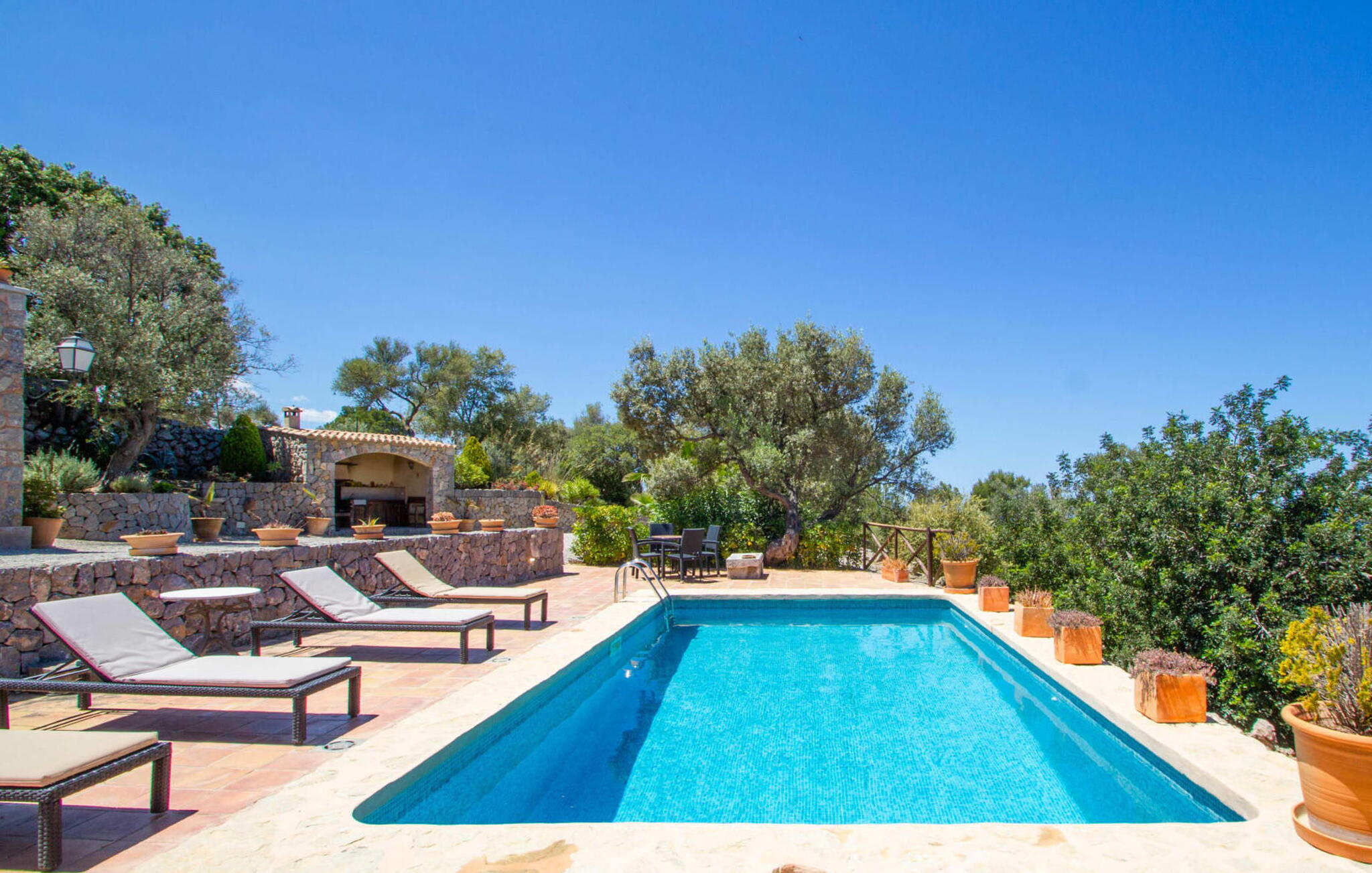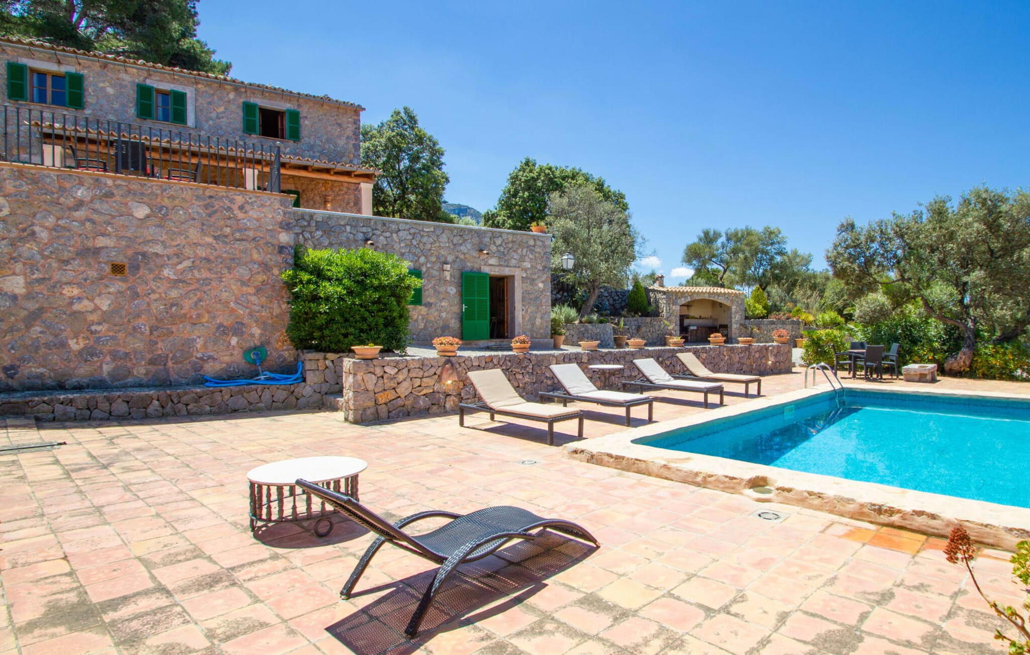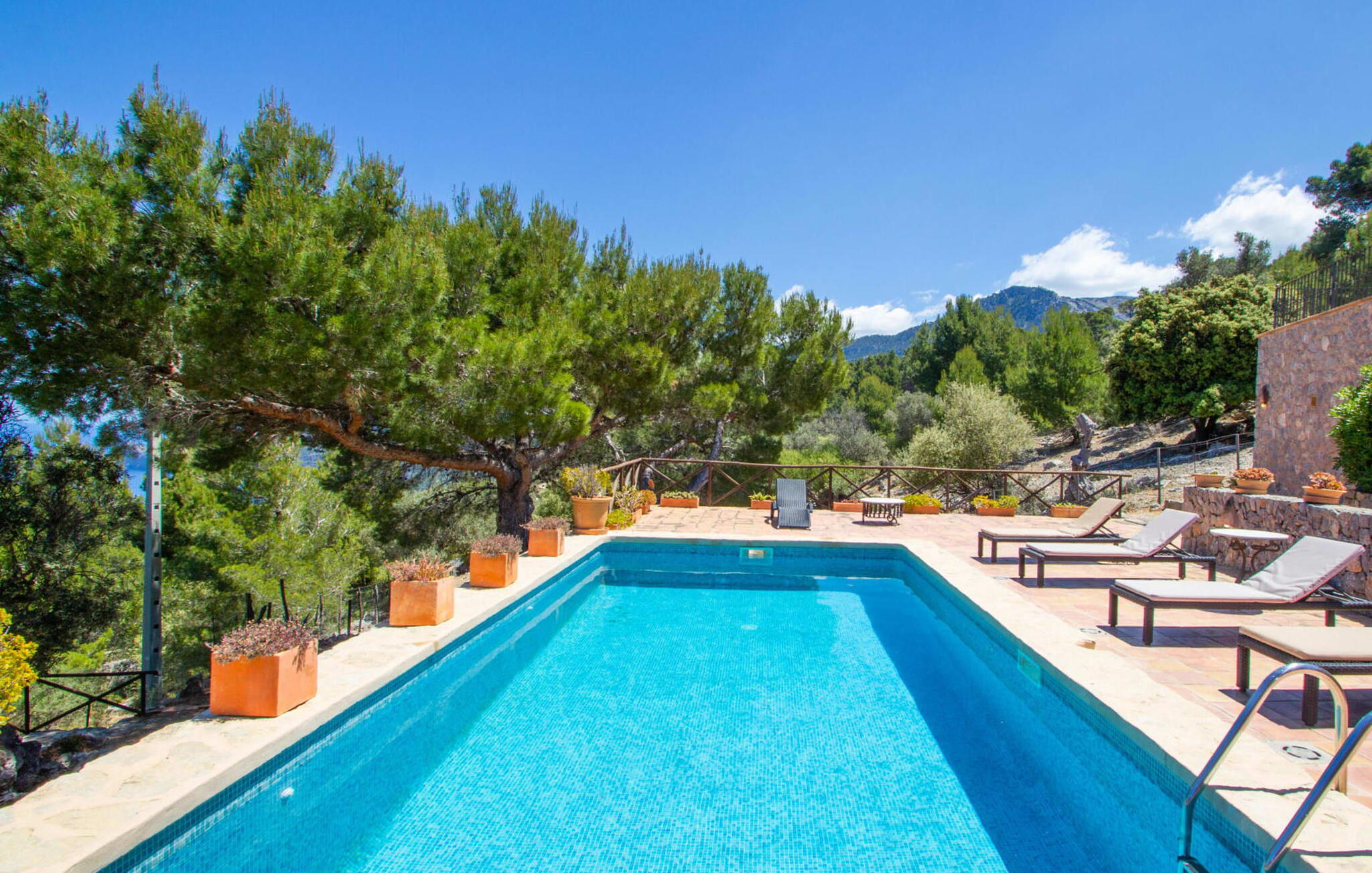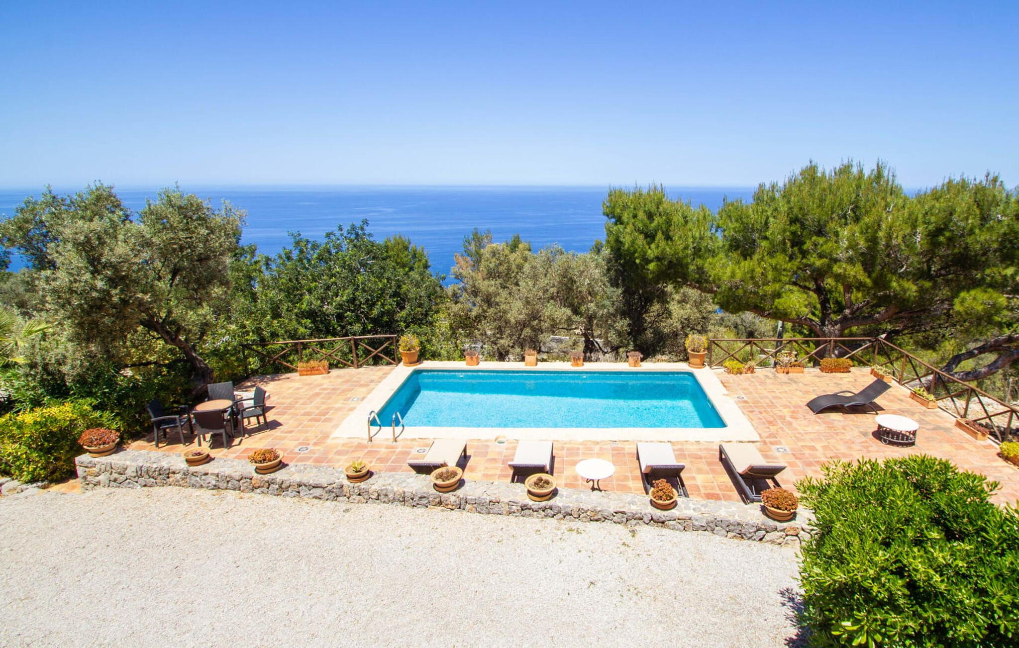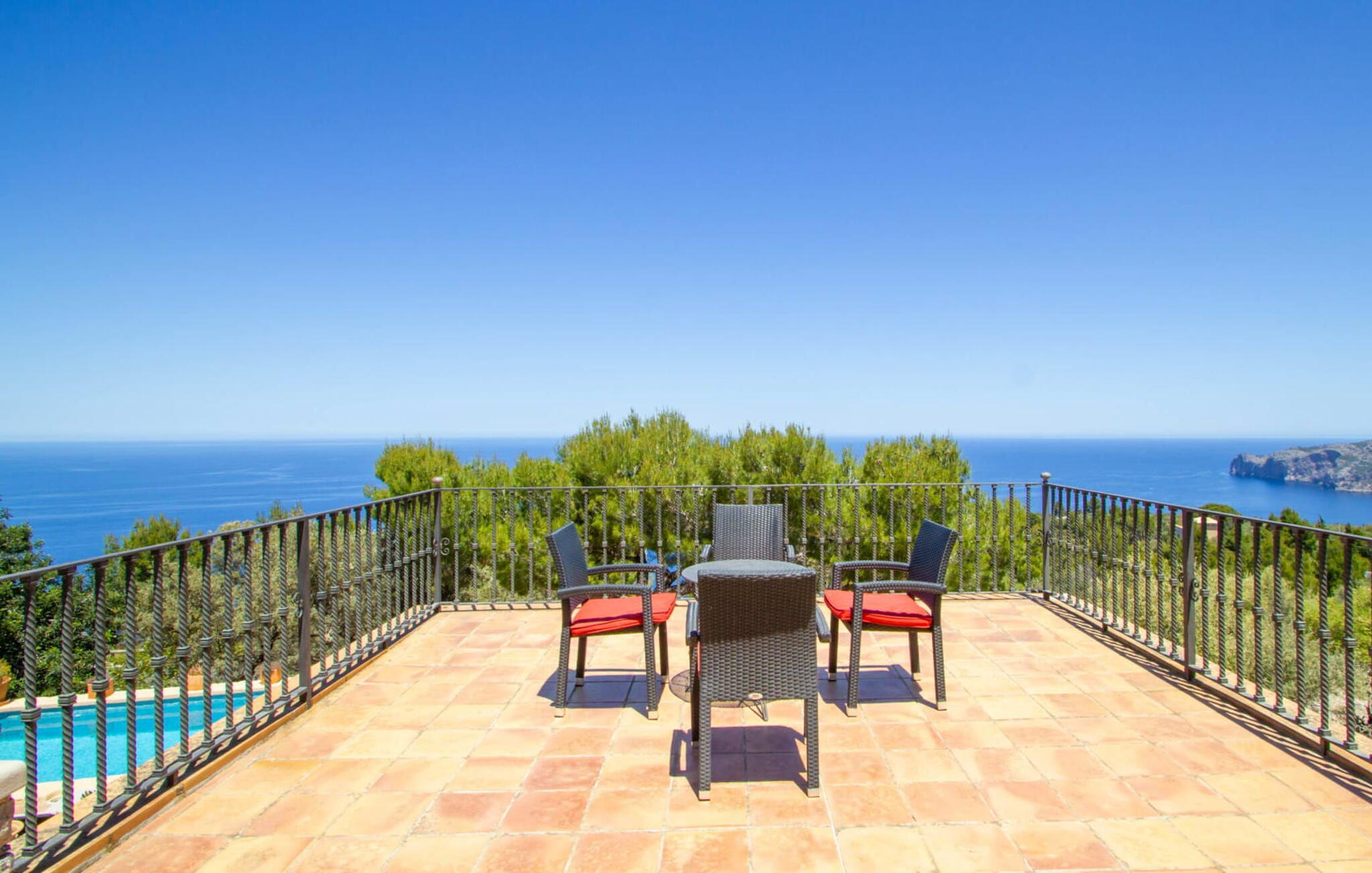 Het pand heeft een uniek terras met meerdere niveaus dat zich uitstrekt tot de rand van een klif en een perfecte omgeving biedt om te ontspannen. De gedeeltelijk overdekte zitgedeeltes bieden schaduw voor zomerse dagen, terwijl de buitengedeeltes bestaan uit ontbijt- en zwembadterrassen met ligstoelen. Geniet van een duik in het zwembad, omringd door nog meer zitgedeeltes. Een hoogtepunt is het panoramische uitzicht op zee, dat de indrukwekkende zuidwestkust van Mallorca laat zien.