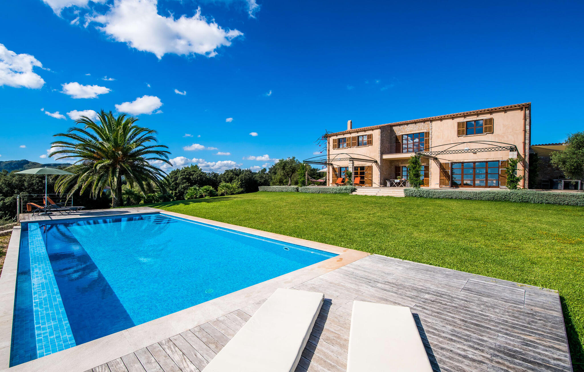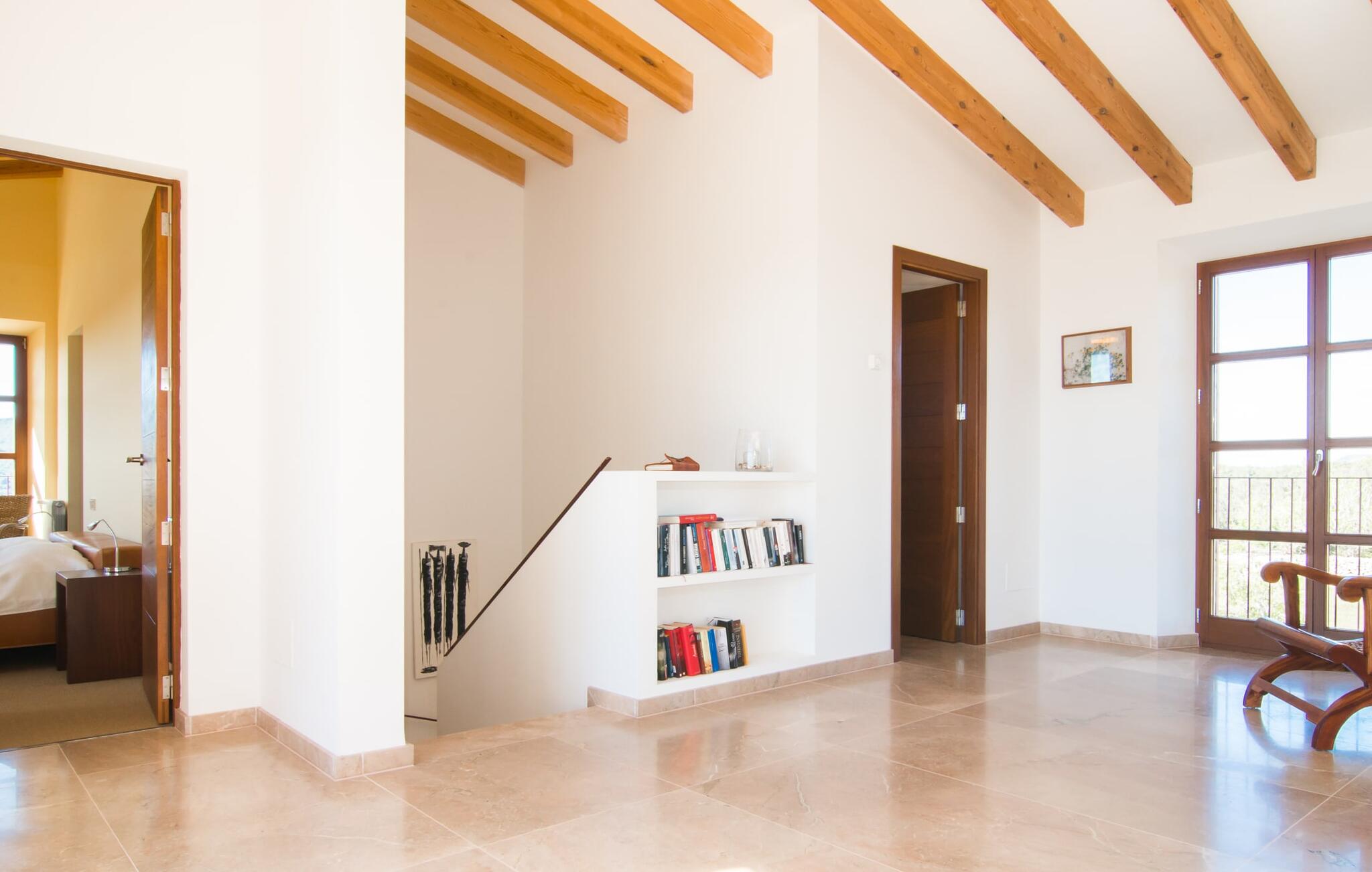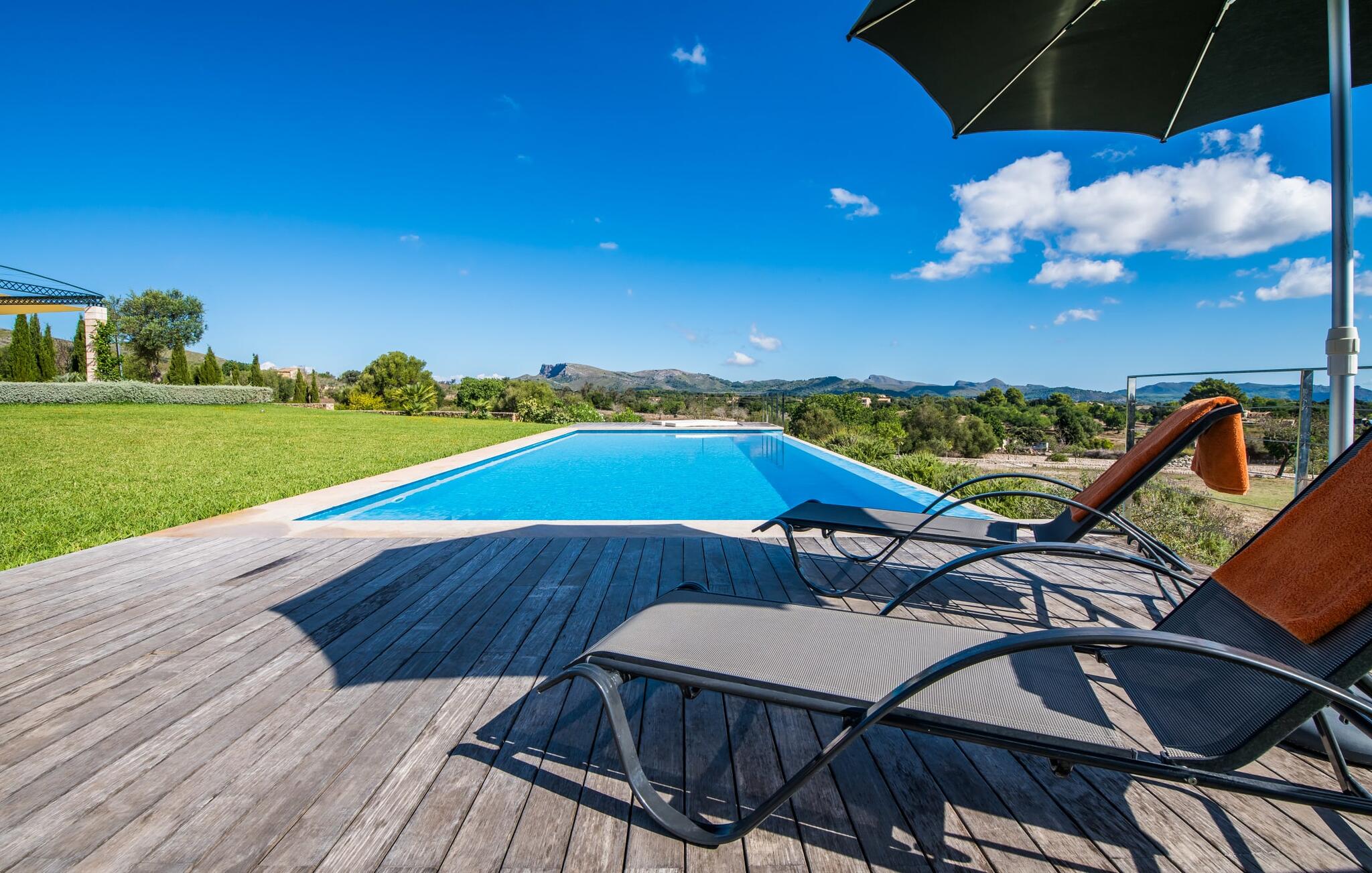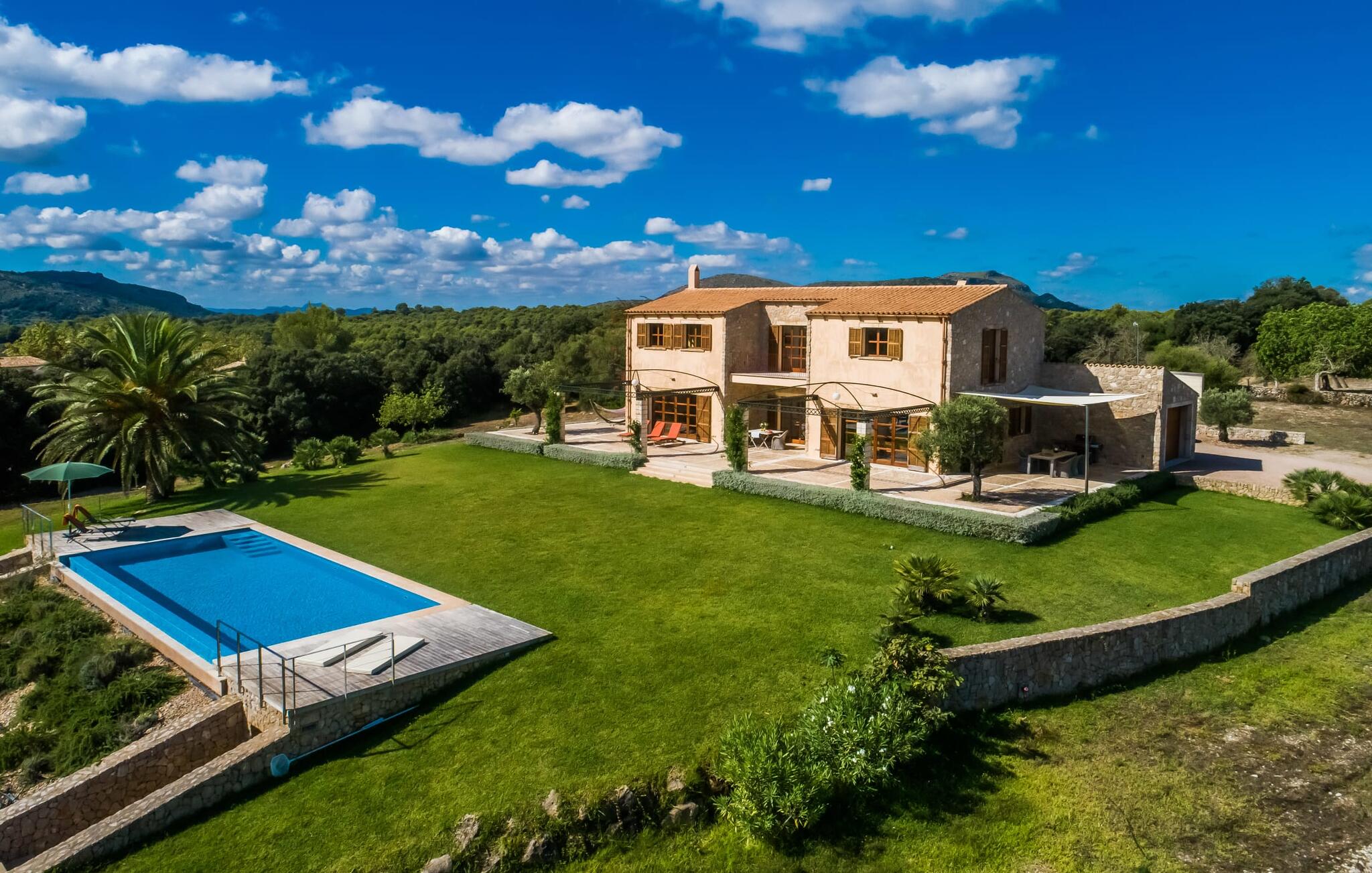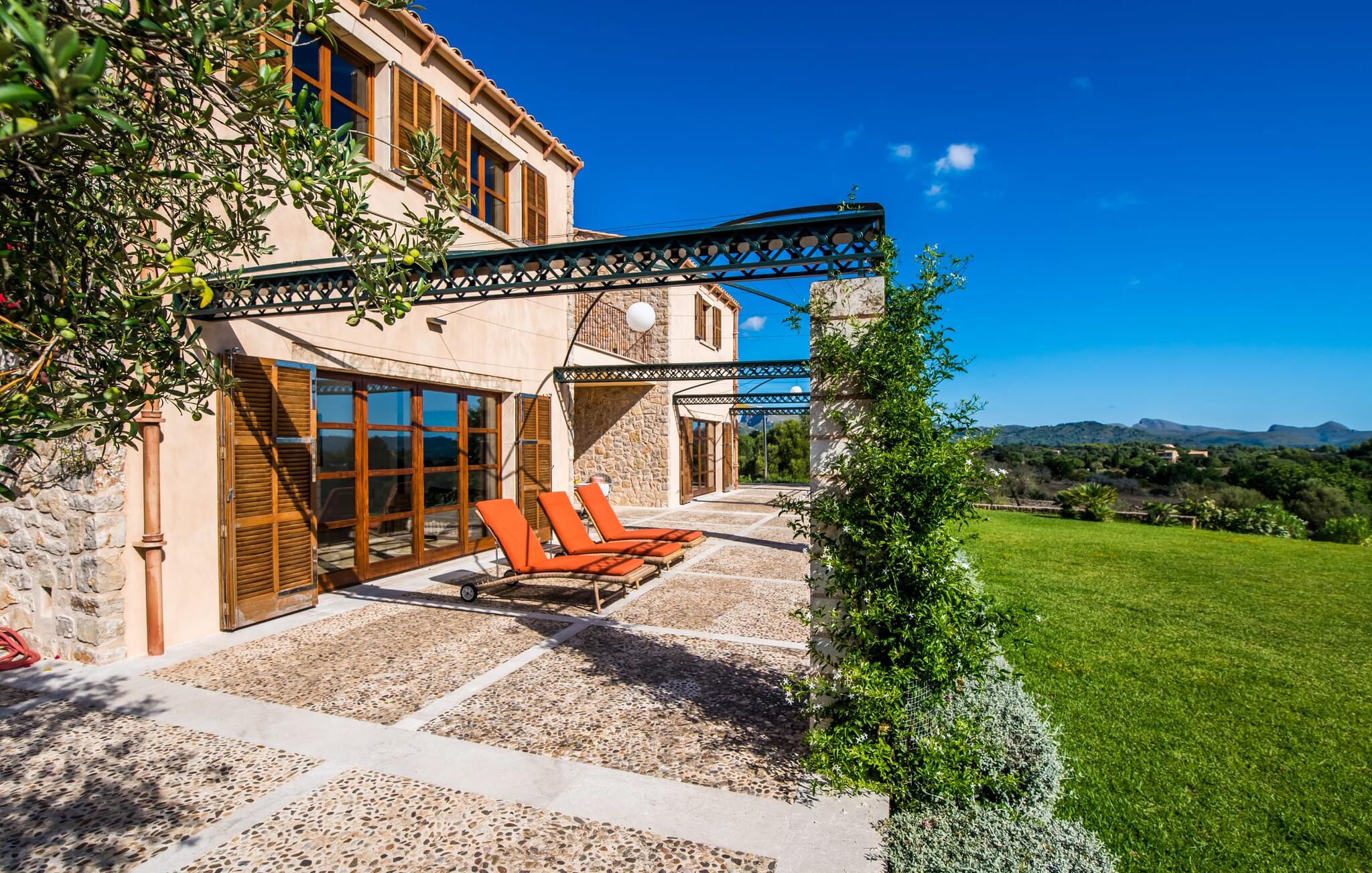 De finca "Vent", met een eigen wijngaard van 4000 m², ligt iets boven de rest van het landschap en biedt een uniek uitzicht over het oosten van het eiland Mallorca. De afgelegen, rustige, landelijke locatie biedt ideale omstandigheden voor een all-round ontspannen vakantie. Een zorgvuldig onderhouden gazon leidt naar een indrukwekkend zwembad. Het ligt een paar treden lager dan het terras van het huis en is bereikbaar via een ruime trap. Het zwembad heeft grote houten terrassen aan beide uiteinden, waar ook de ligstoelen staan. Als je eenmaal een paar baantjes hebt gezwommen en hebt ontspannen op de ligstoelen terwijl je geniet van het fantastische uitzicht over het licht heuvelachtige landschap tot aan de Middellandse Zee, dan ben je op vakantie. Omdat het pand op een lichte helling ligt, was het mogelijk om een comfortabele sauna te installeren in de holle ruimte aan de zijkant van het zwembad. Vooral in het overgangsseizoen of zelfs in de winter kun je hier aangename uren doorbrengen. De buitendouche kan een aangename manier zijn om af te koelen. De finca wordt aan bijna alle kanten omringd door een groot terras. Hier vind je volop mogelijkheden om te ontspannen in de zon of in de schaduw, afhankelijk van je stemming. Er is genoeg ruimte om een hangmat op te zetten. Het overdekte terras is een centraal punt. Aan de grote tafel kun je genieten van een maaltijd of gewoon je gedachten de vrije loop laten met een drankje in de hand. Er zijn nog twee kleine zitjes, waarvan er een ideaal gelegen is aan de voorkant van het huis onder een andere luifel. Er is een moderne mobiele gasbarbecue beschikbaar voor een rustieke barbecue of een meer uitgebreide maaltijd buiten.